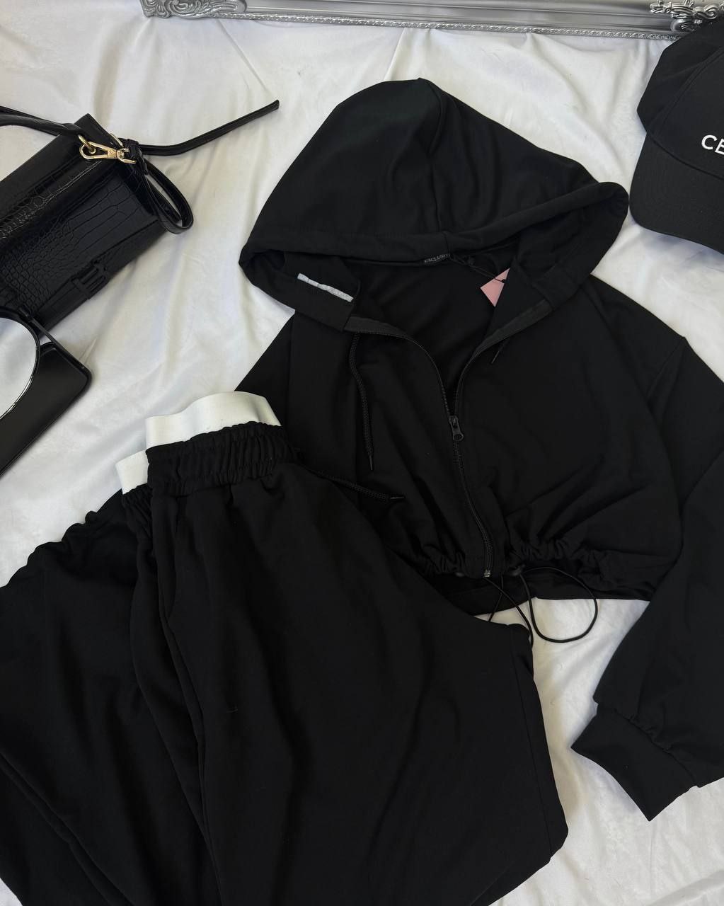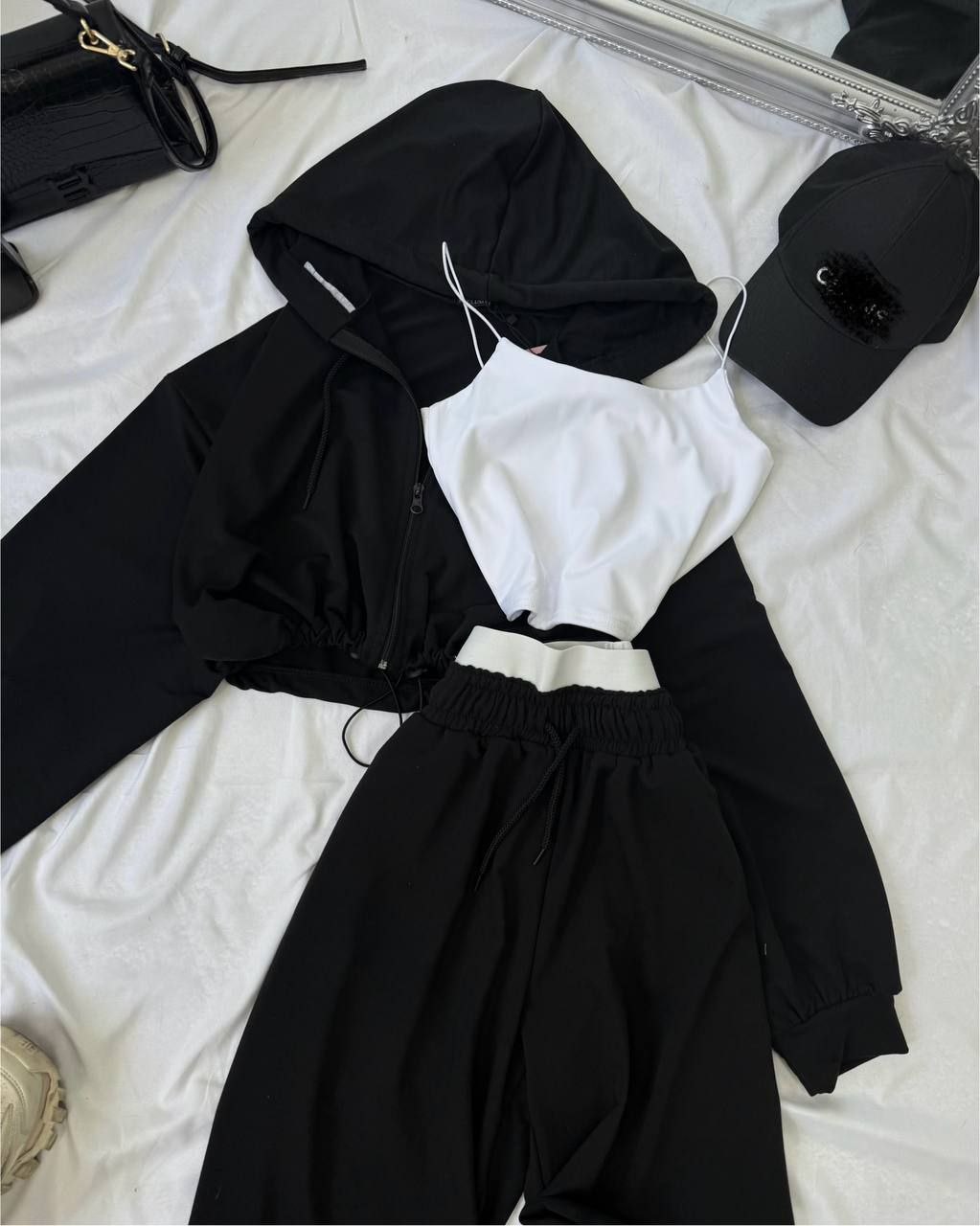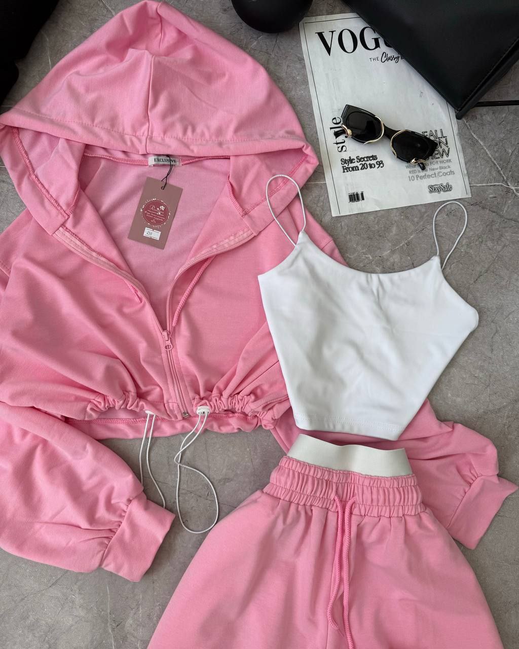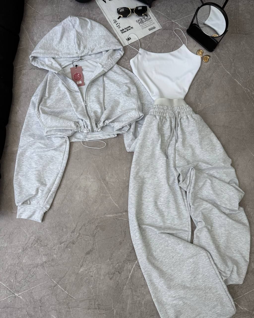 Спортивний прогулянковий костюм - трійка у стилі оверсайз, з вкороченої кофти, топу та обʼємними штанами. Приємна мʼяка тканина, не кошлатиться. Топ тягнеться та сідає по фігурі. Кофта та штани мають знизу фіксатори для зручності. Штани йдуть з резинкою, як на фото, та шнурками.