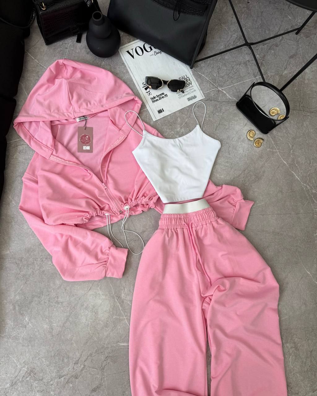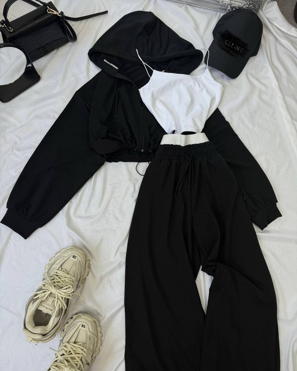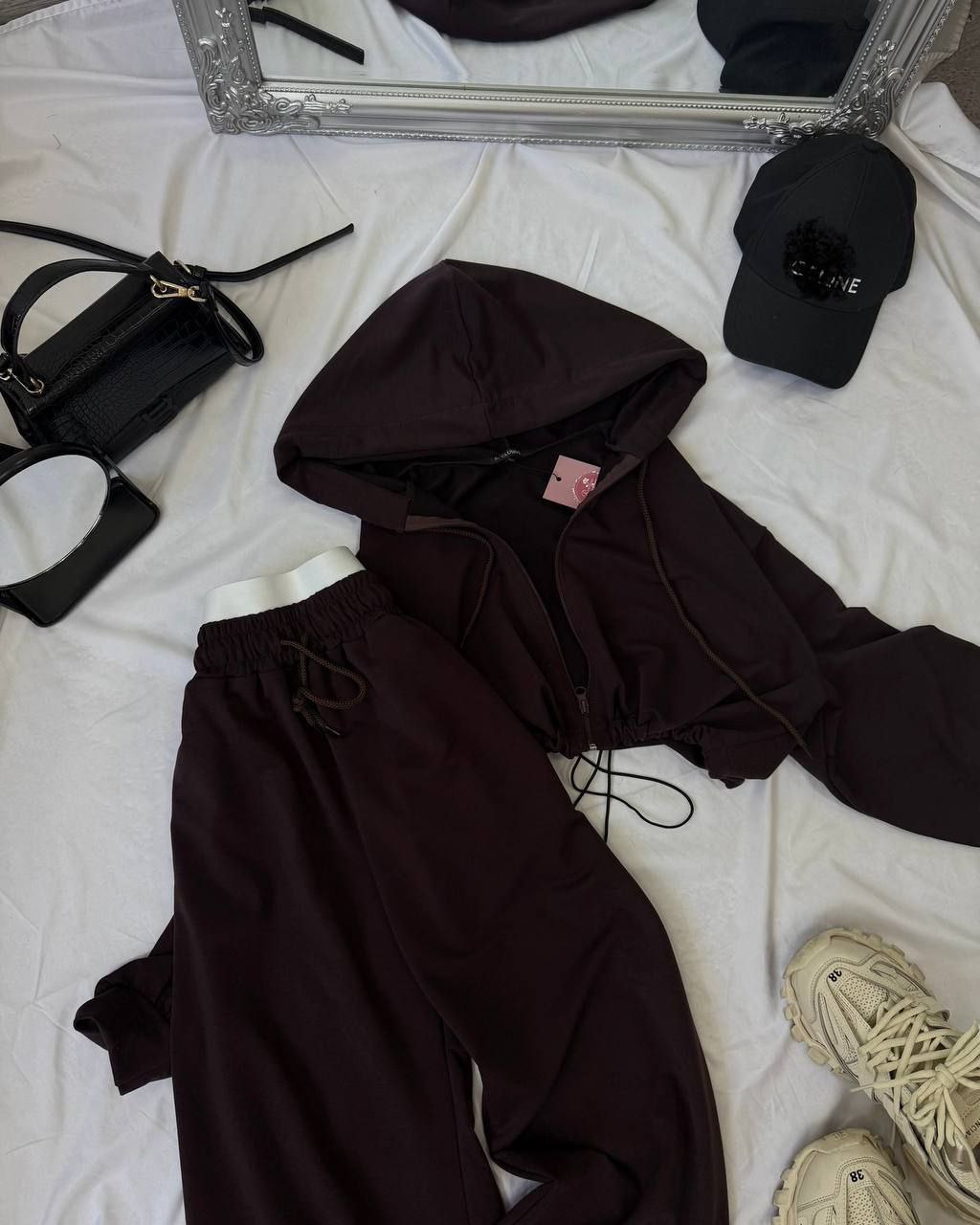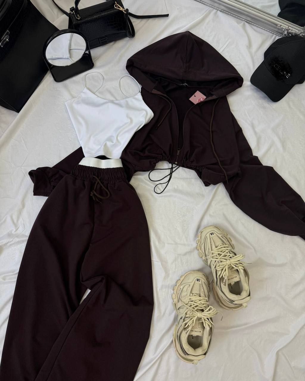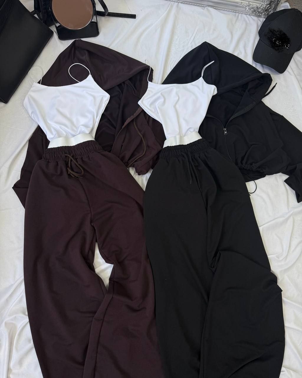 Спортивний прогулянковий костюм - трійка у стилі оверсайз, з вкороченої кофти, топу та обʼємними штанами. Приємна мʼяка тканина, не кошлатиться. Топ тягнеться та сідає по фігурі. Кофта та штани мають знизу фіксатори для зручності. Штани йдуть з резинкою, як на фото, та шнурками.