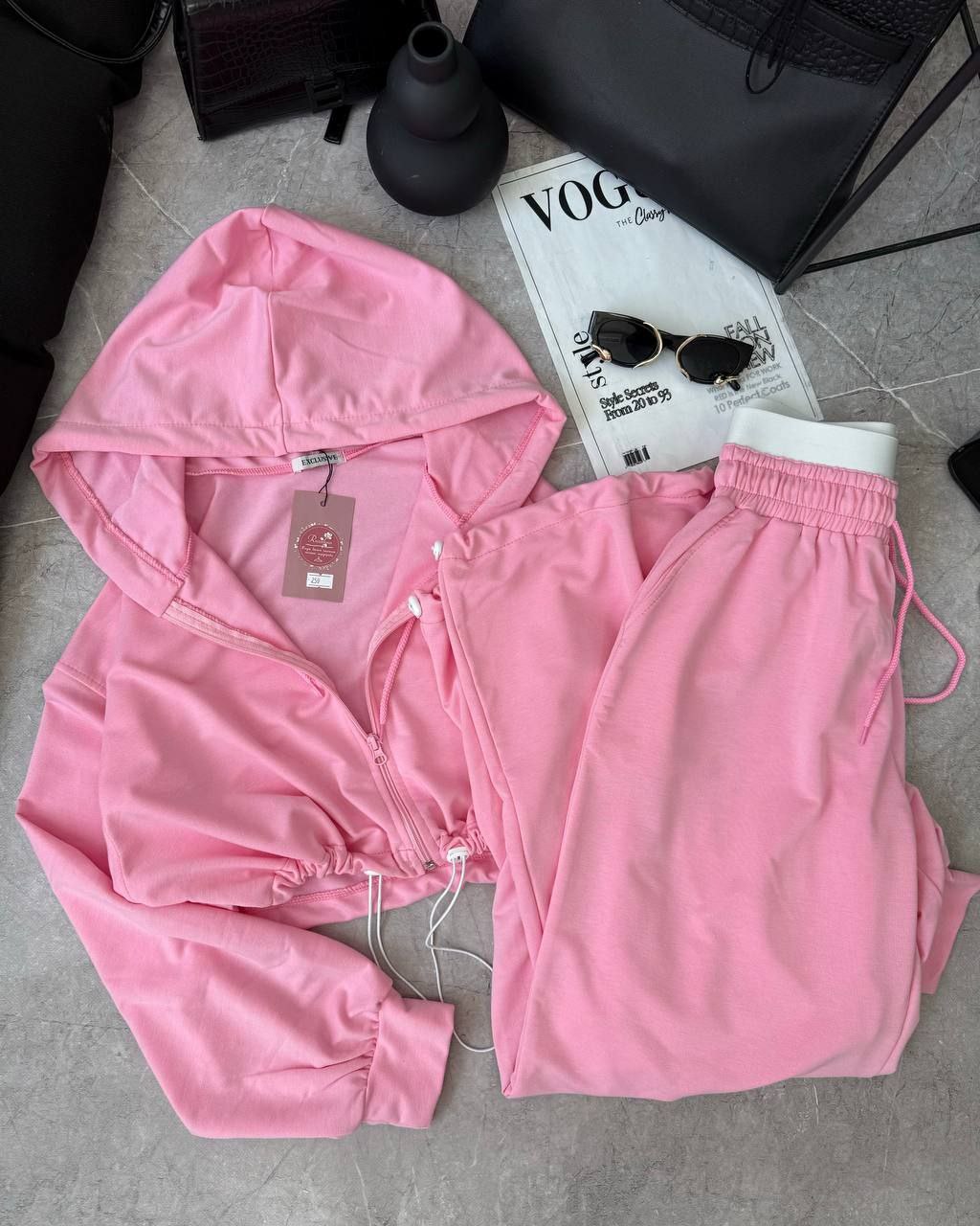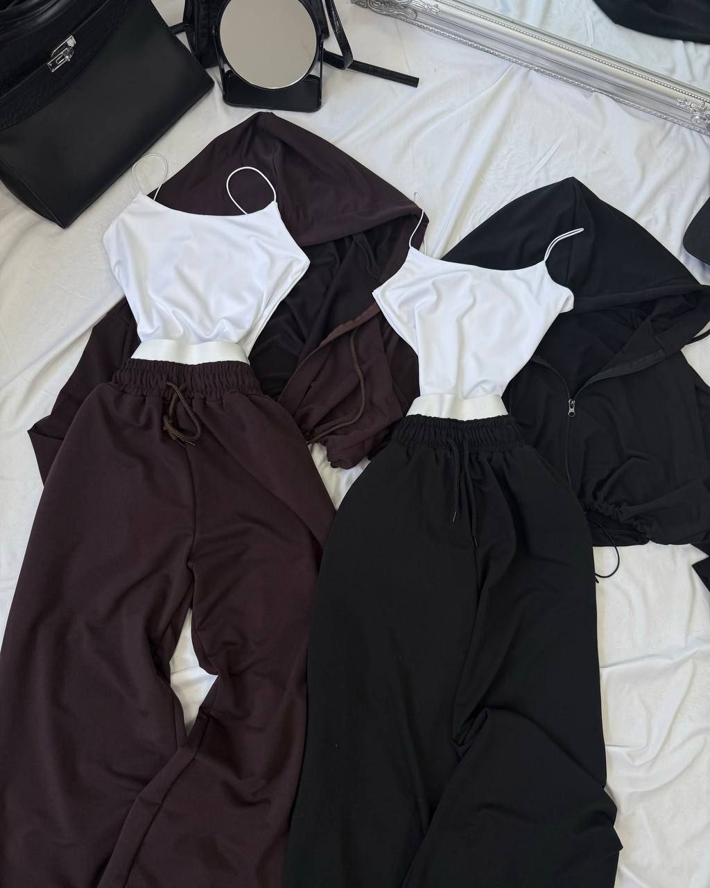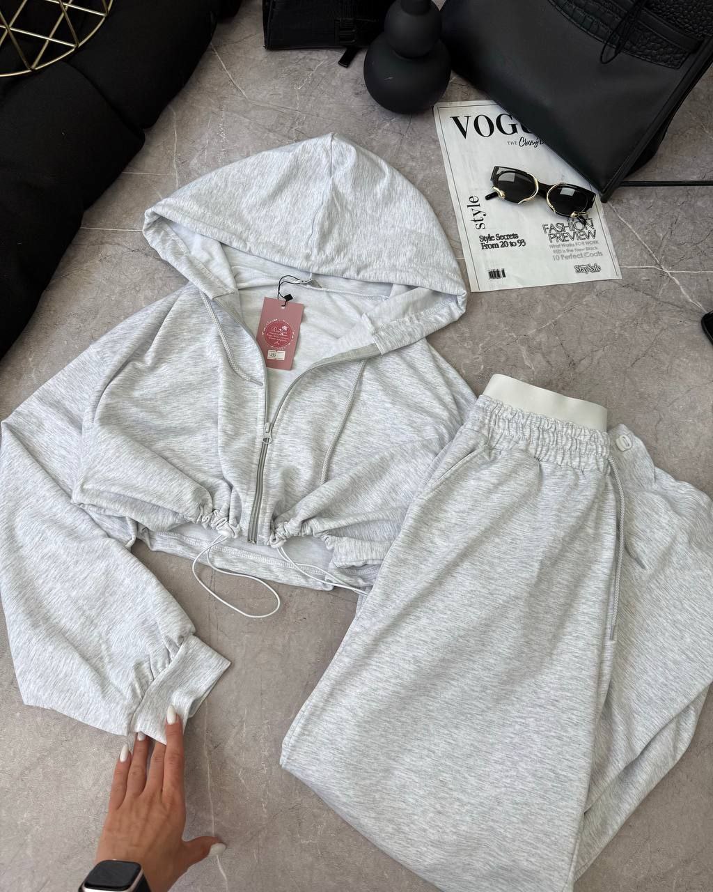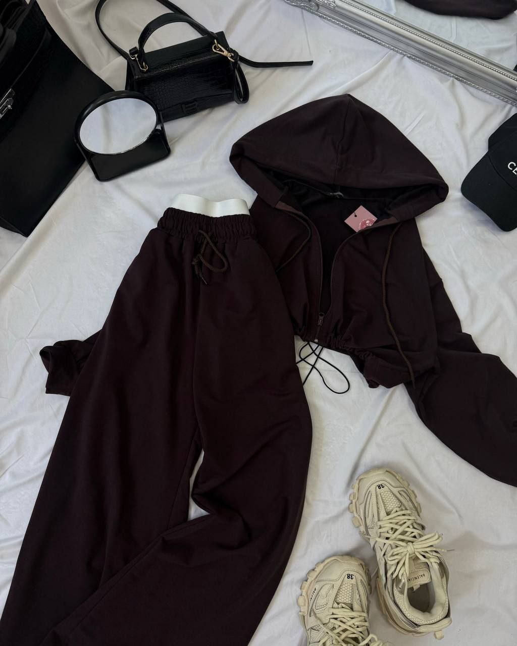 Спортивний прогулянковий костюм - трійка у стилі оверсайз, з вкороченої кофти, топу та обʼємними штанами. Приємна мʼяка тканина, не кошлатиться. Топ тягнеться та сідає по фігурі. Кофта та штани мають знизу фіксатори для зручності. Штани йдуть з резинкою, як на фото, та шнурками.