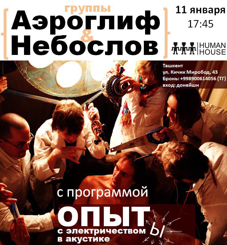 Эксперименты со светом, электричеством, музыкой больших энергий, словами высокой проникающей способности, старыми научными приборами и новыми песнями. Группы «Небослов» и «Аэроглиф» вместе сыграют этот непростой концерт, где смешаются музыка, научность, театр и клоунада.