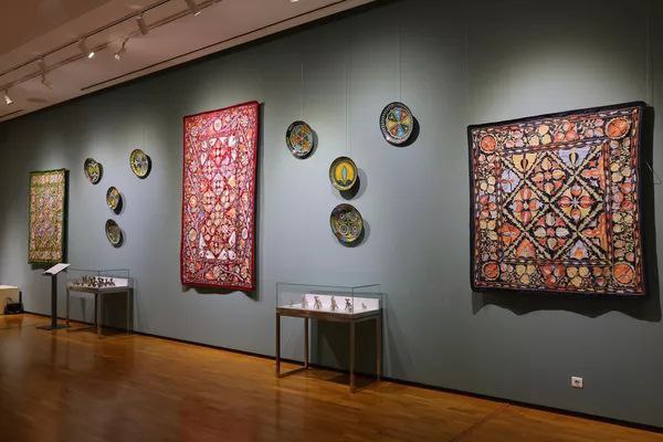 Экспозиция объединяет работы мастеров бухарской школы — керамика, золотое шитьё, чеканка, резьба по дереву, ювелирное искусство, вышивка и ковроткачество.