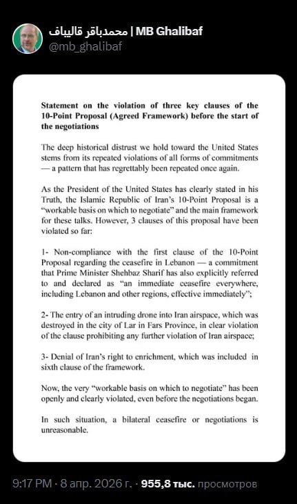 Спикер иранского парламента Мохаммад-Багер Галибаф заявил, что прекращение огня нецелесообразно, так как США нарушили 3 из 10 пунктов предложения до начала переговоров. США нарушили: