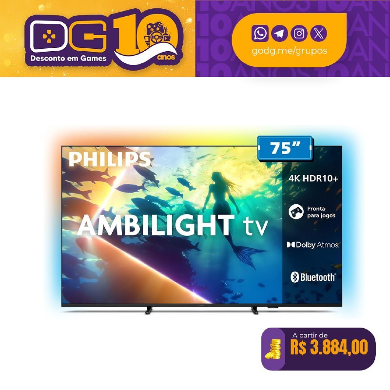 Smart TV LED 4K 60Hz 75" Ambilight 4K - 75PUG8100 - (Amazon)