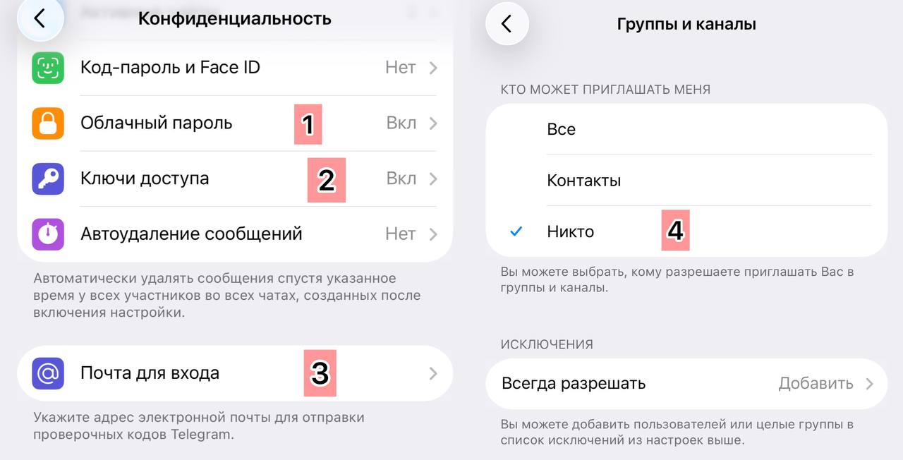 Так вы запретите добавлять себя в фейковые каналы и чаты, через которые чаще всего и происходят взломы.