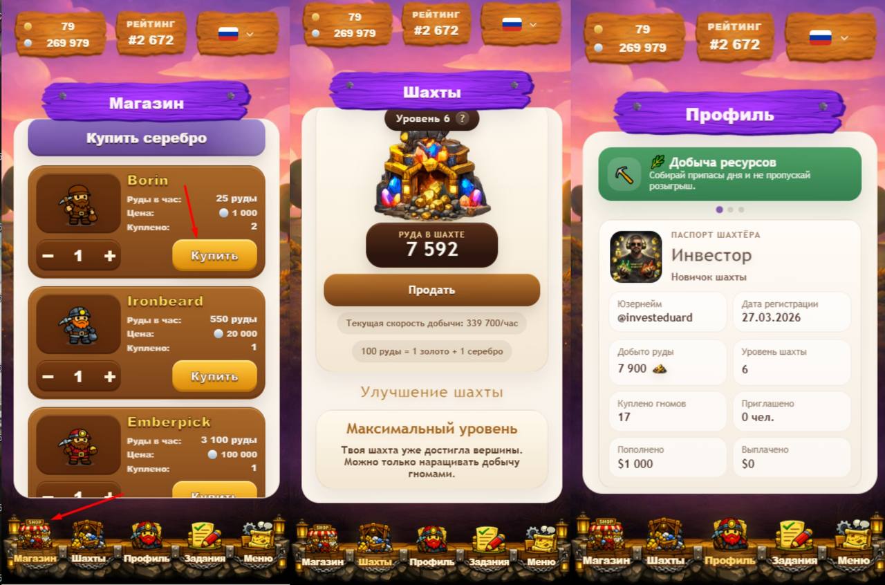 За серебро покупаем гномов и прокачиваем шахту. Гномы добывают руду. Потом продаем руду за золото, обмениваем на $USDT и выводим.