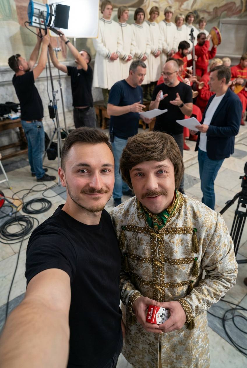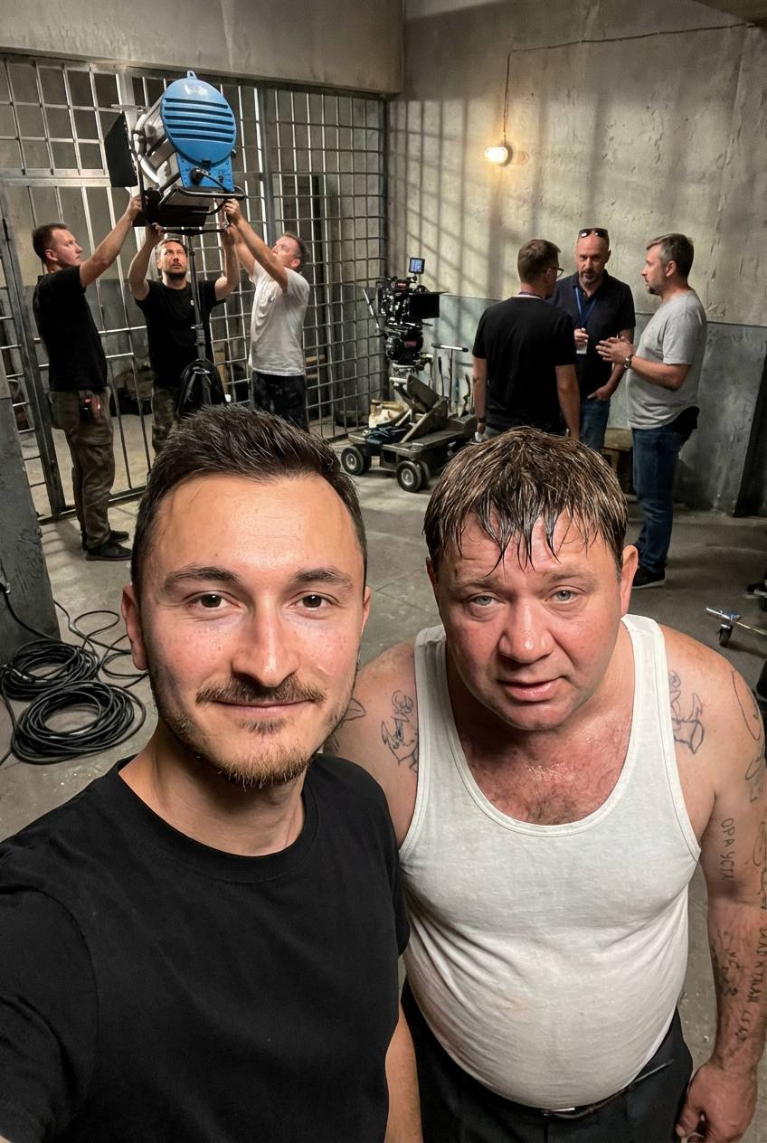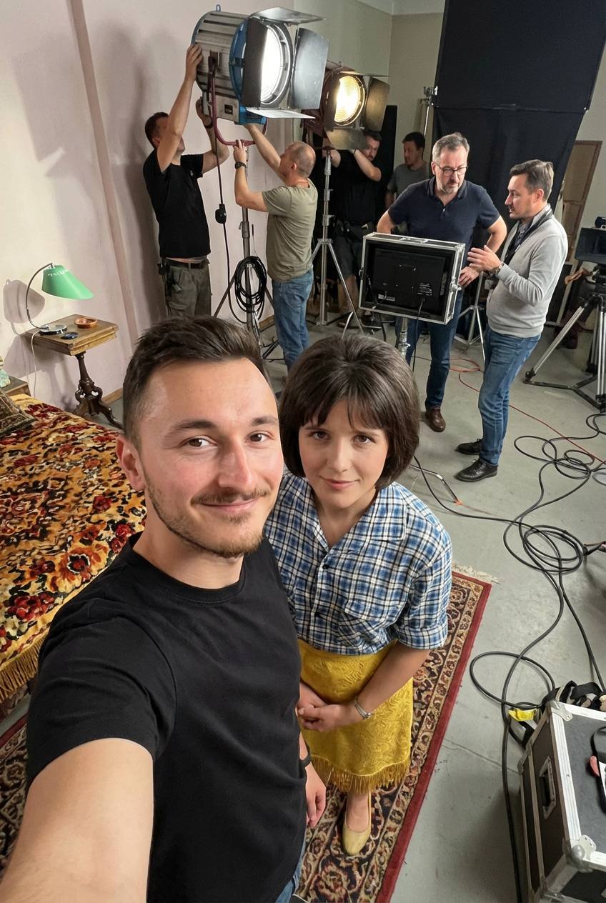 The attached person is taking a selfie with person from image3, image4, standing at location from image5. There is no phone on photo, only selfie with person - POV photo, Crew members are adjusting internal lighting and equipment, with cables and gear visible. Directors and managers are standing behind, discussing the next take.