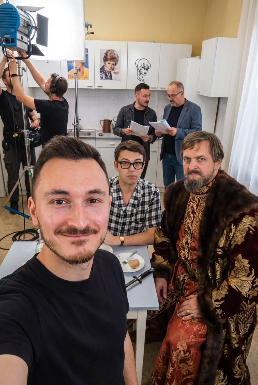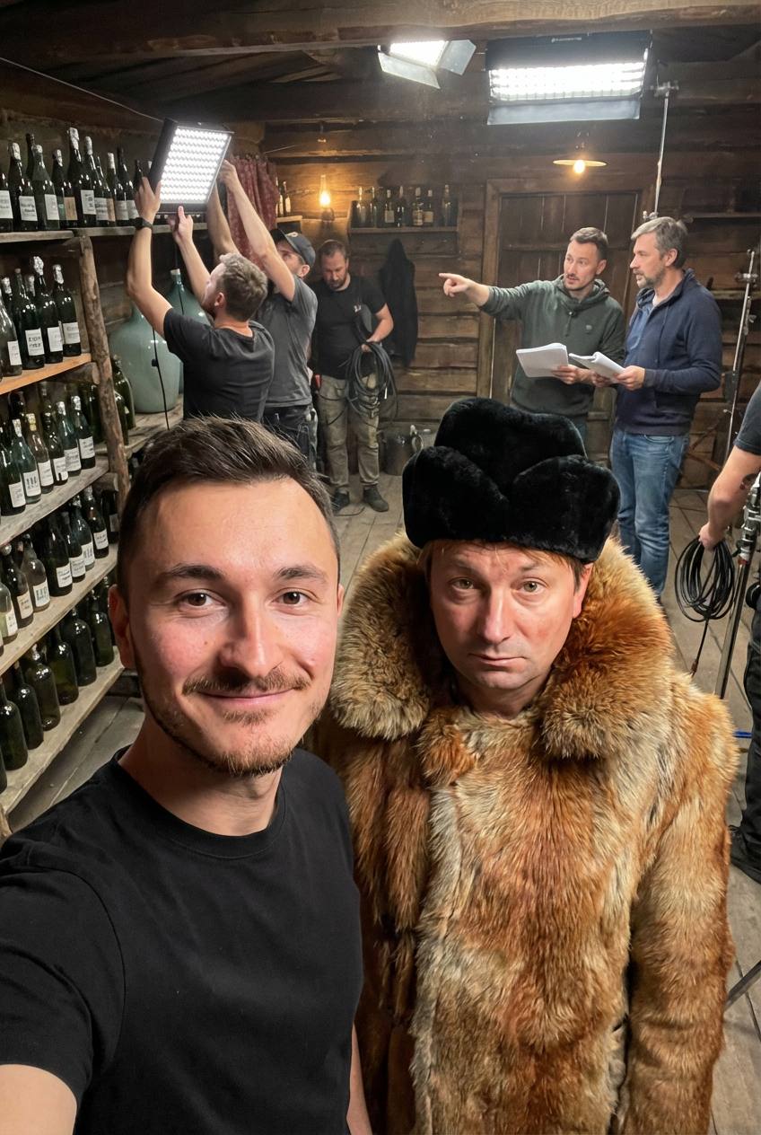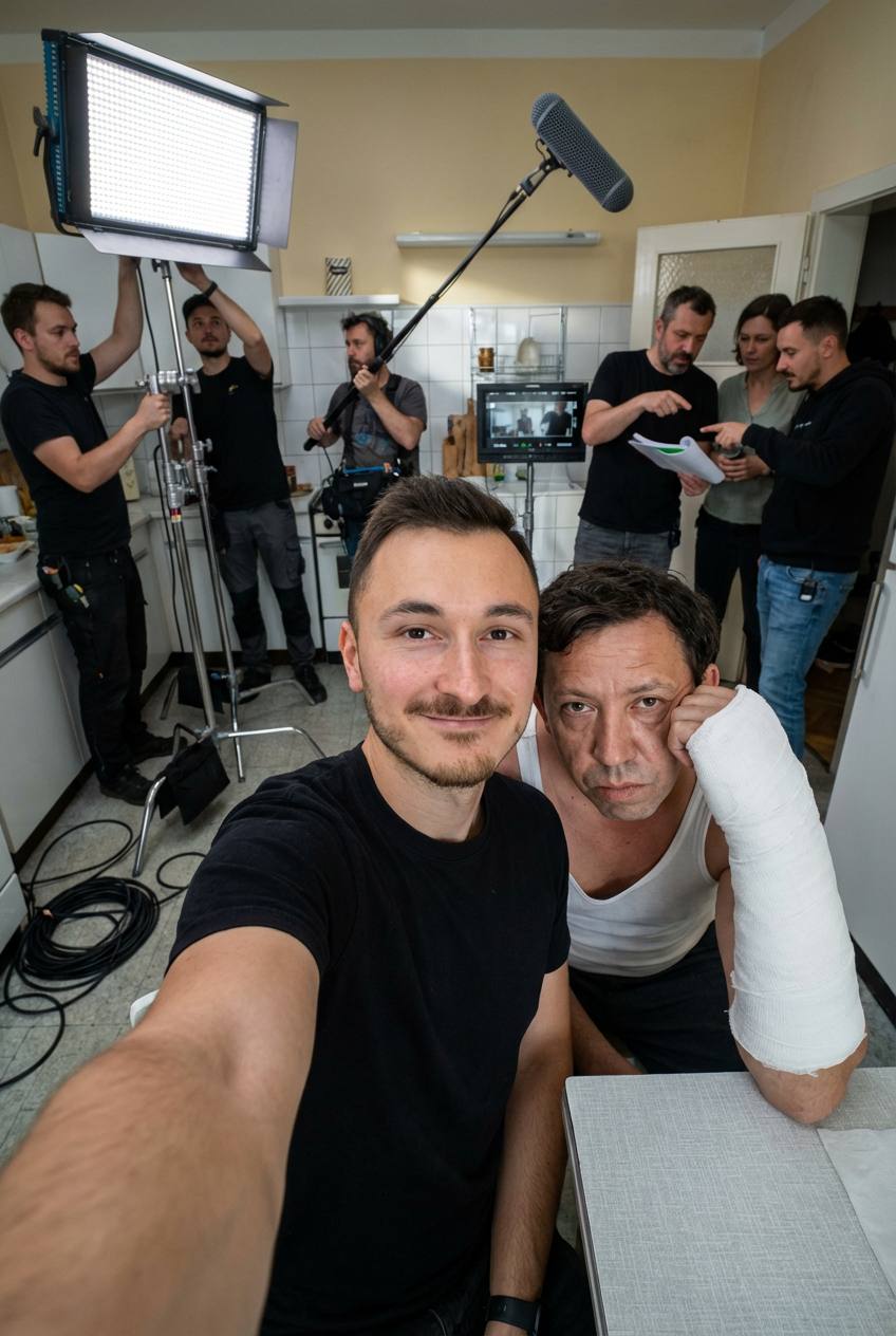 The attached person is taking a selfie with person from image3, image4, standing at location from image5. There is no phone on photo, only selfie with person - POV photo, Crew members are adjusting internal lighting and equipment, with cables and gear visible. Directors and managers are standing behind, discussing the next take.