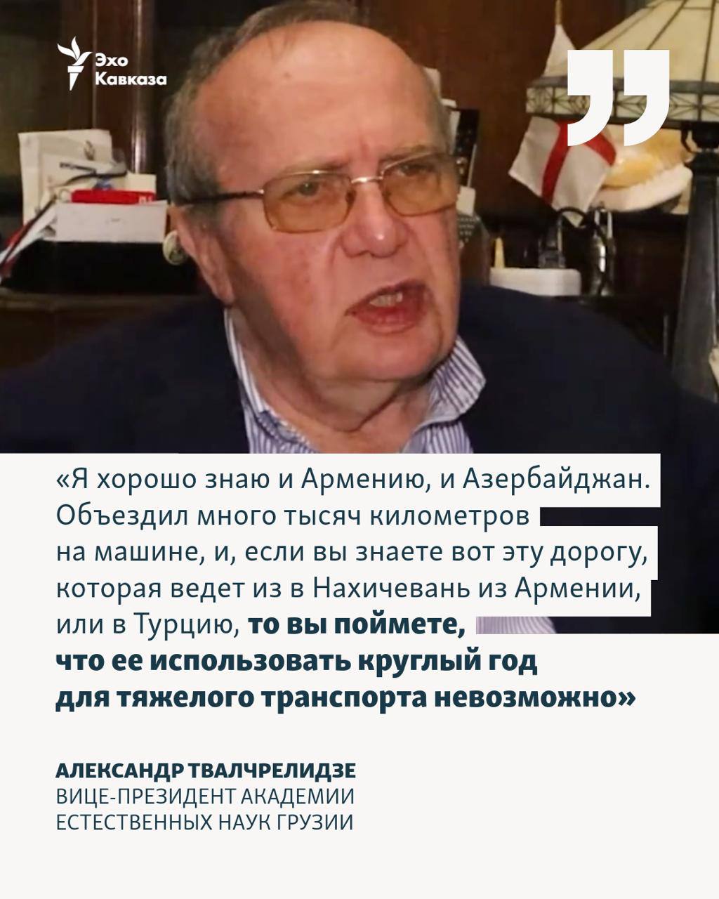 «Я хорошо знаю и Армению, и Азербайджан. Объездил много тысяч километров на машине, и, если вы знаете вот эту дорогу, которая ведет из в Нахичевань из Армении, или в Турцию, то вы поймете, что ее использовать круглый год для тяжелого транспорта невозможно. Точно так же есть вопросы к железной дороге, потому что она будет проходить в Турции по очень чувствительным местам, я имею в виду Турецкий Курдистан. Таким образом, это больше, мне кажется, политические заявления, чем реальный какой-то проект, имеющий по собой экономическую основу»