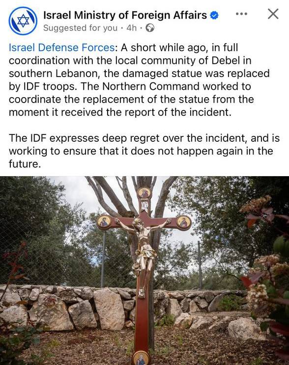 В то же время, когда израильский солдат на территории Ливана разбил статую Иисуса Христа и фотография этого распространилась, все официальные лица Израиля принесли извинения христианскому миру, поскольку вопрос был поднят как христианскими государствами, так и Ливаном, около 35–40% населения которого составляют христиане.