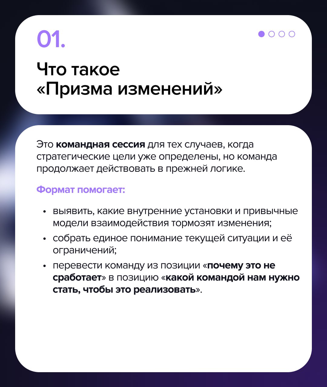 Для команд, оказавшихся в таких ситуациях мы проводим сессию «Призма изменений». Это формат, который помогает команде увидеть свои внутренние барьеры, собрать общий контекст и понять, что именно ей нужно изменить в себе и во взаимодействии, чтобы начать двигаться по-новому.