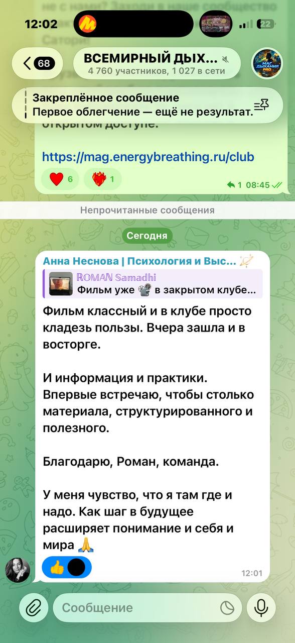 Как психолог и энерго практик с опытом более 20 лет, хочу сказать что этот опыт - ценный и глубинный процесс и что я благодарна и своей интуиции за то что пошла в январе на марафон, прошла Мага Дыхания предыдущего совсем недавно и принятому решению пойти на новый курс и он другой совсем! Кто был на предыдущем Маге, сейчас все иначе 🙏 благодарна и Роману, Ольге и команде, то что вы делаете, это спасет наш мир вместе с красотой потому что это и есть духовная красота 😍