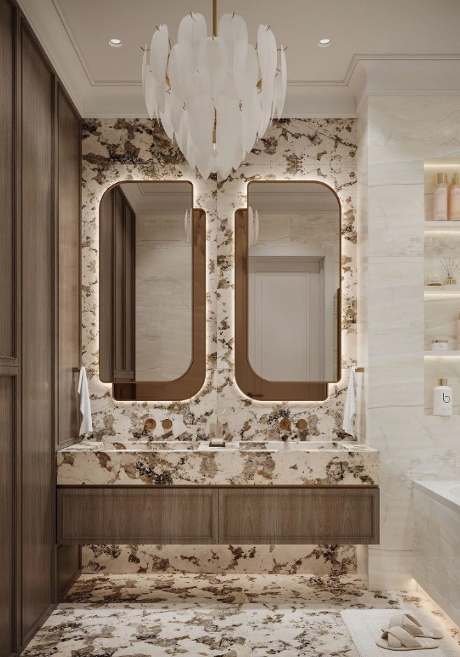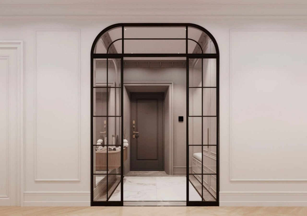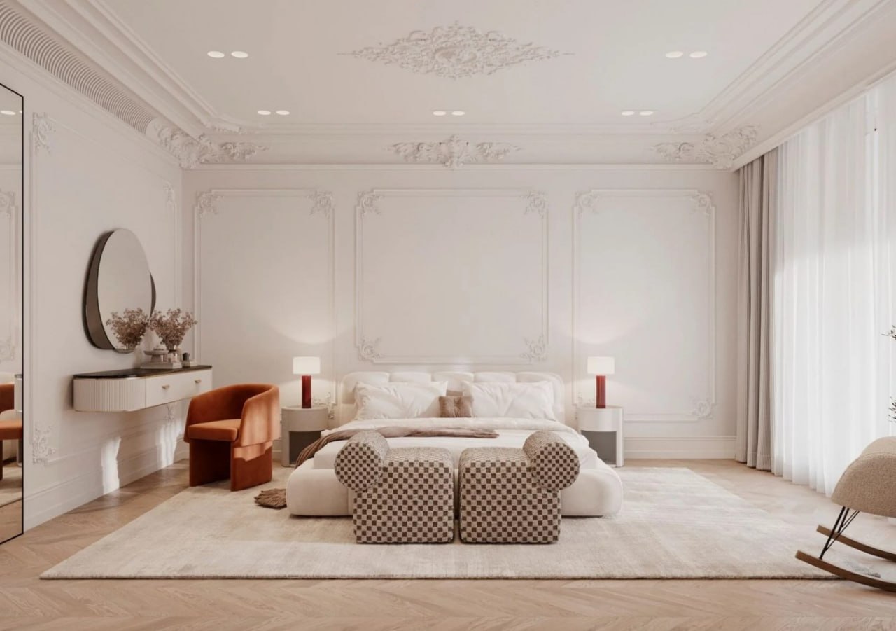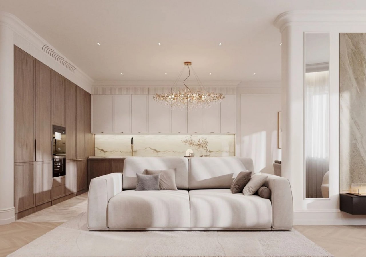 "Светлая, почти воздушная палитра задаёт тон всему пространству квартиры. Стены, декорированные элементами лепного декора, играют светом и тенью, добавляя глубины и объёма. А правильно подобранные цветовые акценты для каждого пространства оживляют палитру. Использование натуральных материалов привносят естественную теплоту и подчёркивают статус владельцев.