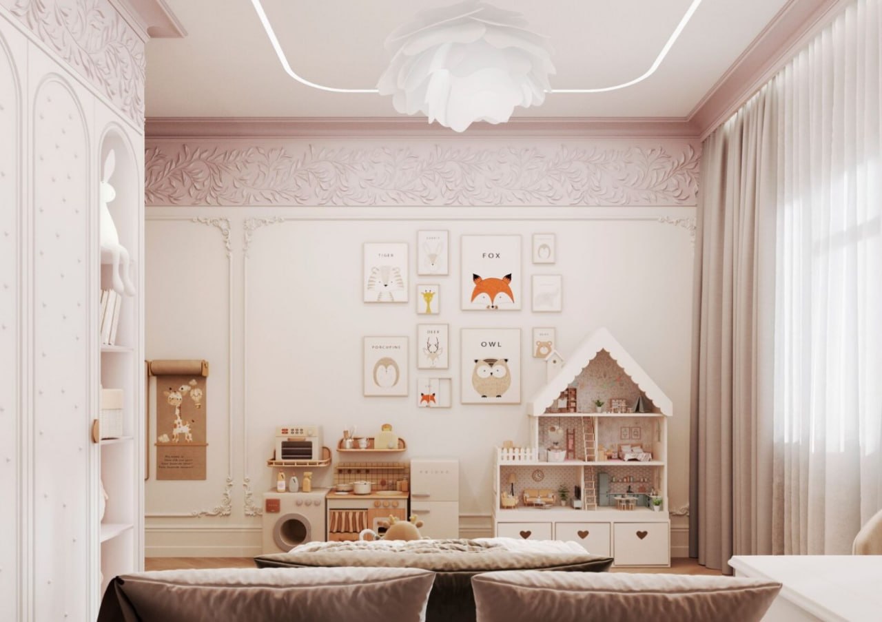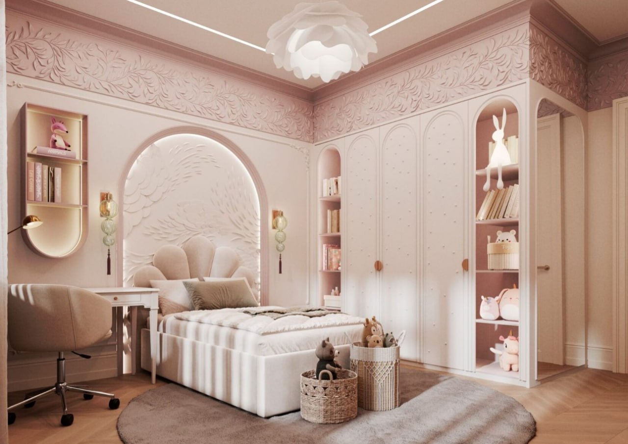 Особое внимание уделено детской комнате, превращённой в сказочное королевство для маленькой принцессы. При этом, комната остаётся функциональной и просторной, предоставляя малышке достаточно места для развития творческих способностей и активных игр".