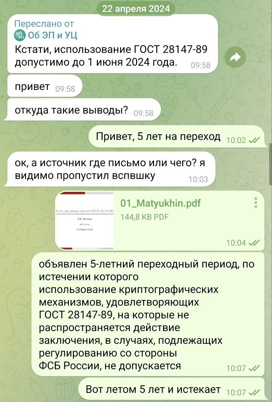 Вопрос этот поднял, т.к. в чате канала переодически поднимаются вопросы перехода со старого ГОСТ, а официальной информации нет. Товарищ полтора года назад ещё спрашивал, откуда дата 1 июня 2024 года. Переход на ГОСТы 2012 года электронной подписи и хэширования помнят все УЦ, но с шифрованием переход получается в "тихом" режиме.