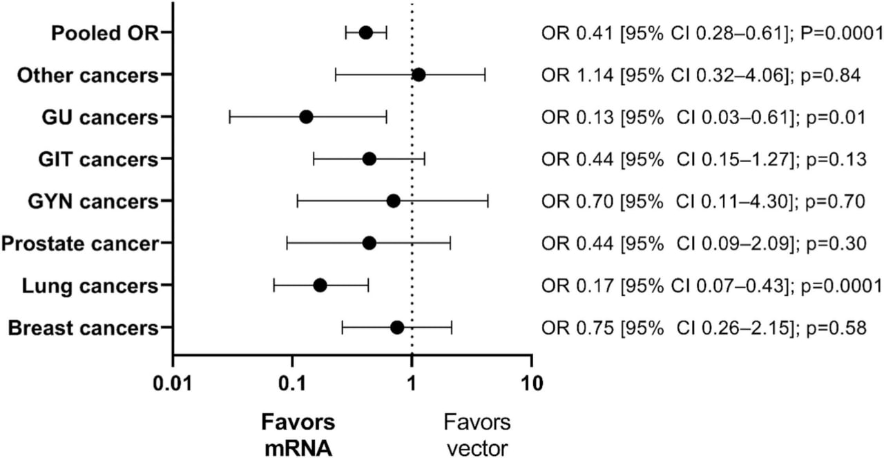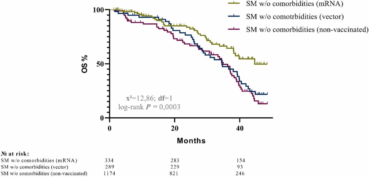 🔹Применение мРНК‑вакцин было независимо ассоциировано с улучшение выживаемости пациентов - медиана ОВ составила 43,6 месяца против 34,9 месяца при векторных вакцинах и 34,5 месяца у невакцинированных (OR 0,41; 95% ДИ 0,28-0,61; p<0,0001);