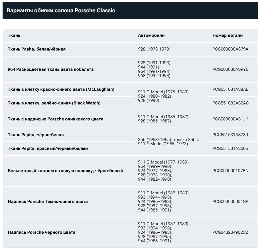 Чтобы облегчить процесс реставрации, компания Porsche вернула обивку Pasha, Pepita и Tartan