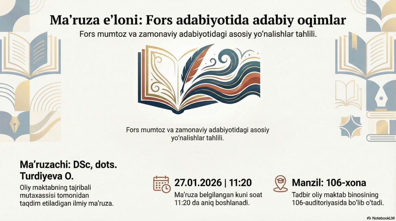 ✨ 2026-yilning 27-mart kuni Eronshunoslik va afg'onshunoslik oliy maktabi dotsenti, DSc Turdiyeva Oydin Zafariddinovnaning «Fors adabiyotida adabiy oqimlar» mavzusidagi nazariy seminari o'tkaziladi.