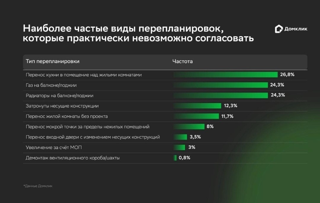 Согласно исследованию, чаще всего россияне меняют перегородки. Демонтаж этих конструкций встречается в 34,4% случаев, а возведение новых - в 20,7%. Среди других распространенных преобразований - демонтаж встроенного шкафа или кладовой (12,3% случаев), перенос кухни (14,4%), совмещение санузла (4,7%), объединение коридора с комнатой (4,6%).