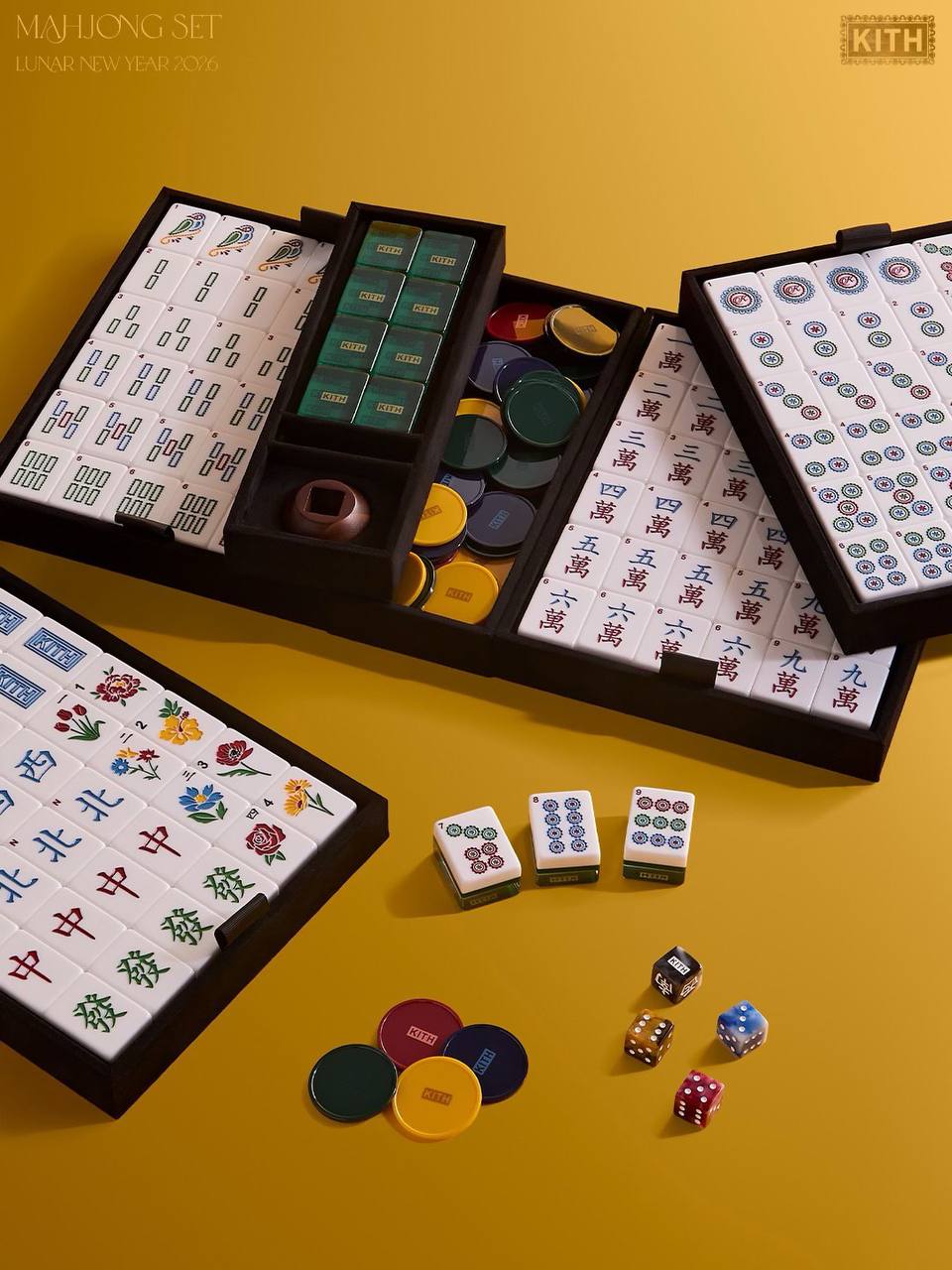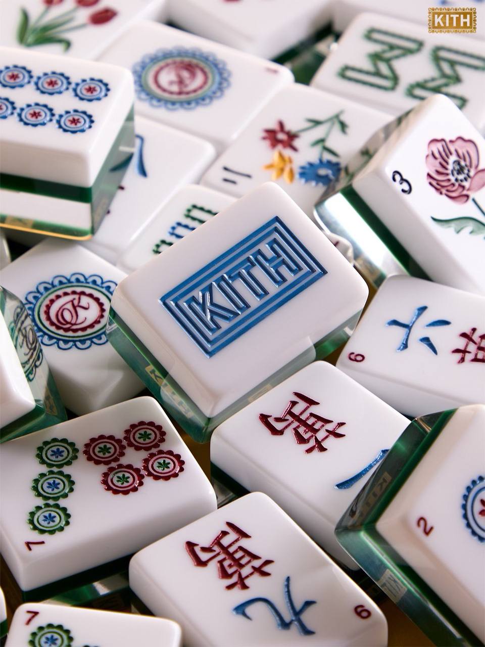 Так в коллекцию TREATS от Kith как будто вошло вообще все: набор игральных карт, два варианта кожаного брелка Pegasus, 5 складывающихся красных конвертов Kith с золотым тиснением (по традиции нужно дарить красные конверты с деньгами), а также худи, футболки и, конечно, маджонг.