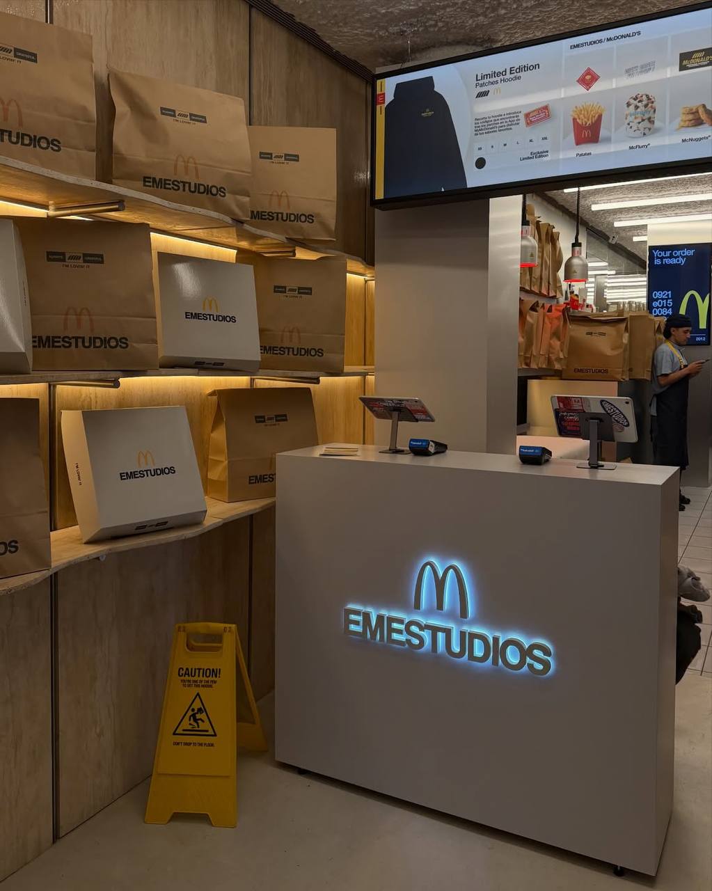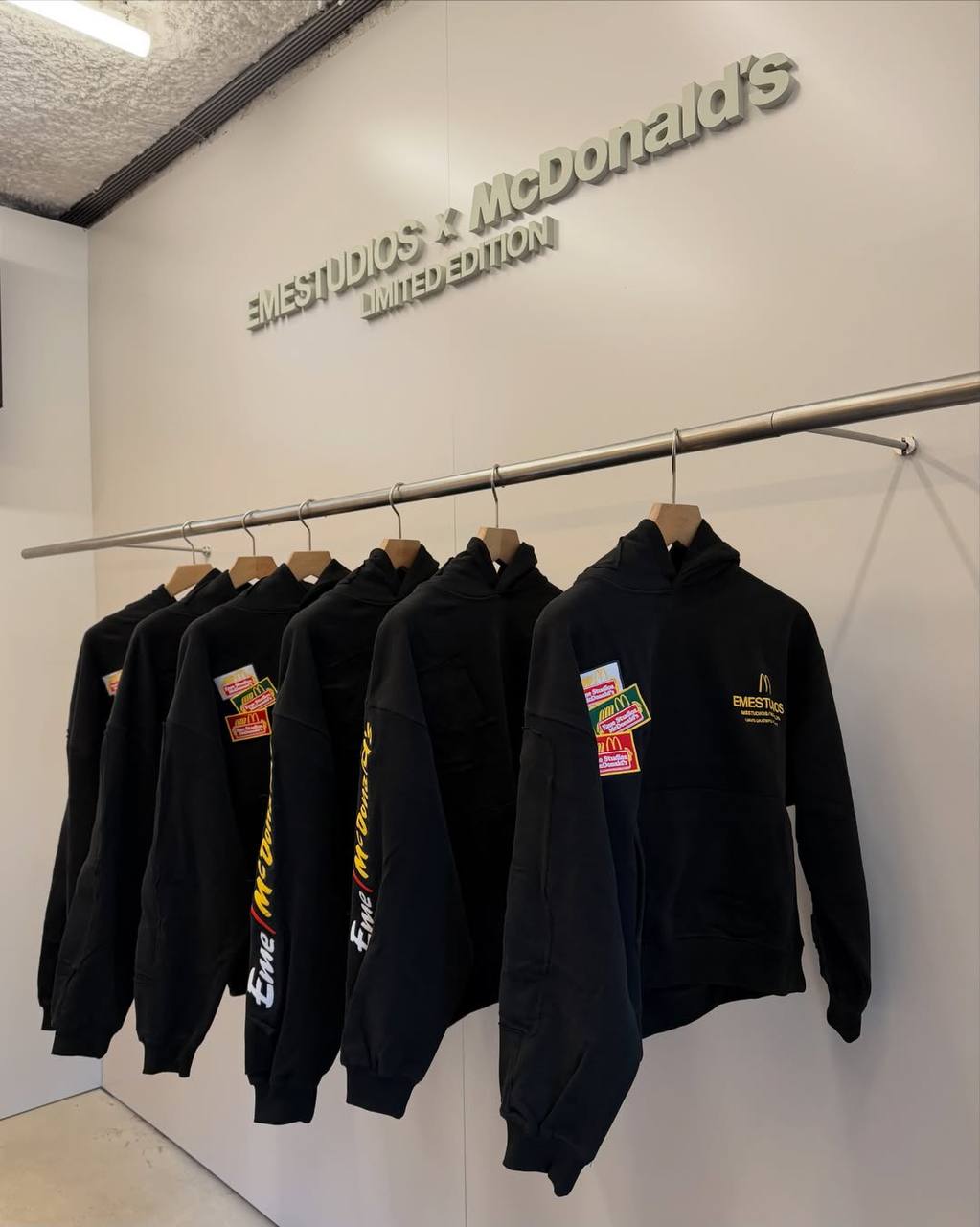 Для этого шоурум перестроили в точку McDonald’s, где продавцы в форме с желтой буквой принимали заказы. Но в огромных стилизованных пакетах выдавали не бургеры, а худи.