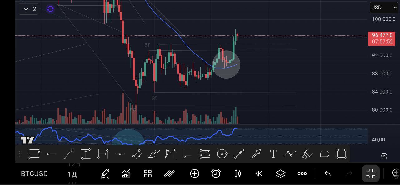 Цена биткоина за последнее время выросла и покупатели смогли пробиться выше сопротивления в зоне $95 000. Тем не менее я ожидал, что цена все же протестирует нижнюю границу диапазона. Однако актив выполнил условия, которые описывал для роста: