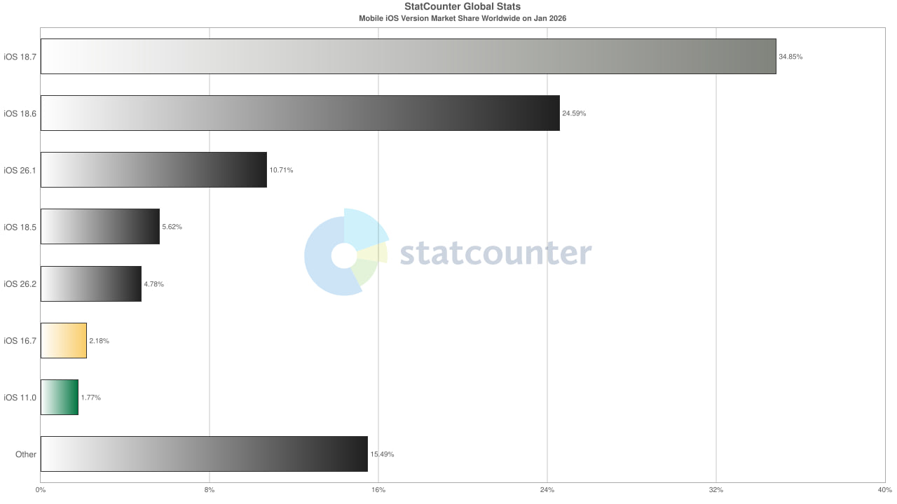Официально: «жидкое стекло» — абсолютный провал. На январь 2026, iOS 26 пользуются лишь 15-20% всех айфонобогов — большинство остались на старых версиях.