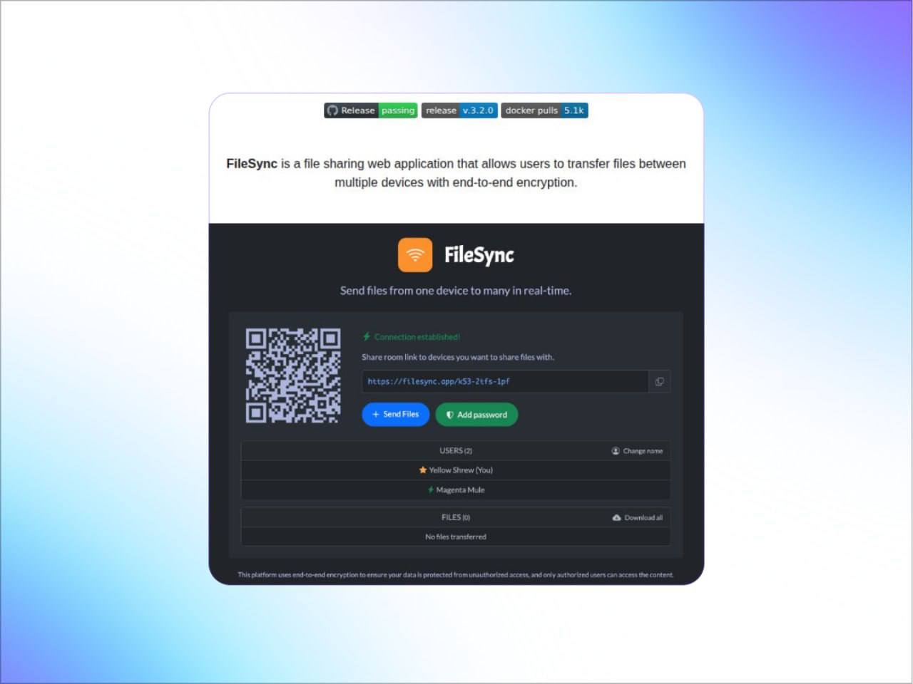Работает прямо в браузере: заходишь, выбираешь файл и он одновременно летит на несколько устройств в реальном времени. Передача идёт напрямую между устройствами, с end-to-end шифрованием — файлы нигде не сохраняются и не проходят через сервер.