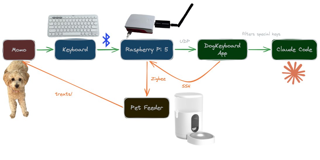 Система работает на Raspberry Pi: когда пёсель Момо пишет запрос для LLM, он получает лакомства, а Claude — новое задание. Чтобы собачьи тыгыдыки по клавиатуре могла понимать нейросеть, её убедили, что запросы пишет эксцентричный гений, который ничего не говорит прямо, а выражается загадками.