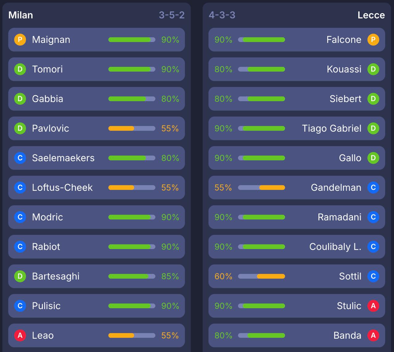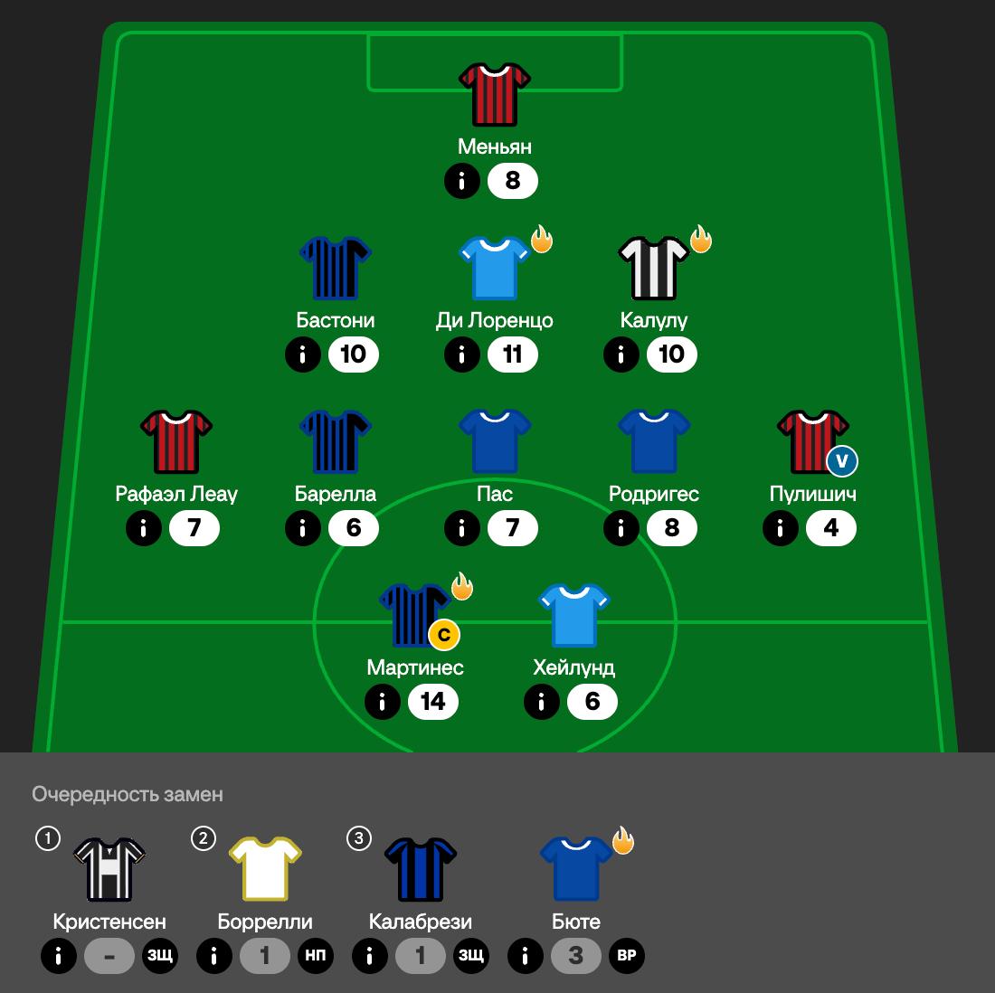 🟢 Чаще всего покупают 1. Мактоминей (Наполи) пз 11.0 – 23.2% 2. де Кетеларе (Аталанта) пз 8.5 – 20.4% 3. Калулу (Ювентус) защ 5.5 – 14.2% 4. Рабьо (Милан) пз 6.5 – 12.2% 5. Пеллегрино (Парма) нап 5.5 – 10.0% 🔴 Чаще всего продают 1. Чалханоглу (Интер) пз 8.0 – 22.2% 2. Модрич (Милан) пз 7.0 – 16.0% 3. Пас (Комо) пз 8.0 – 14.8% 4. Франса (Рома) защ 5.5 – 11.1% 5. Павлович (Милан) защ 5.0 – 9.5%
