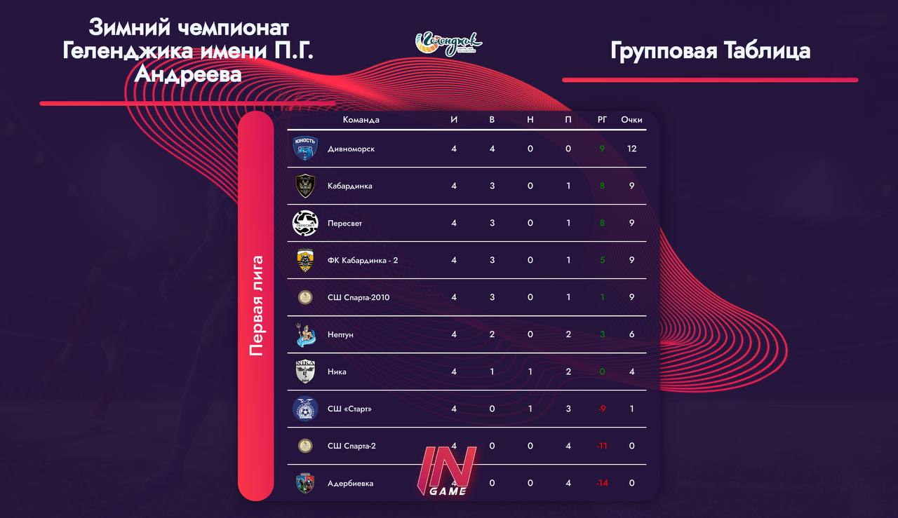 В «Первой лиге» определился единоличный лидер — это команда «Дивноморск», которая все свои матчи выиграла и имеет 12 очков. На втором месте — сразу 4 команды, у которых по 9 очков: «Кабардинка», «Пересвет»,«Кабардинка‑2» и «Спарта‑2010». Дальнейший расклад по очкам: 6 очков — команда «Нептун»; 4 очка — команда «Ника»; 1 очко — команда «Старт» (набрала первые очки вчера); и пока без на разных очков 2 команды «Спарта‑2» и «Адербиевка» 🩵