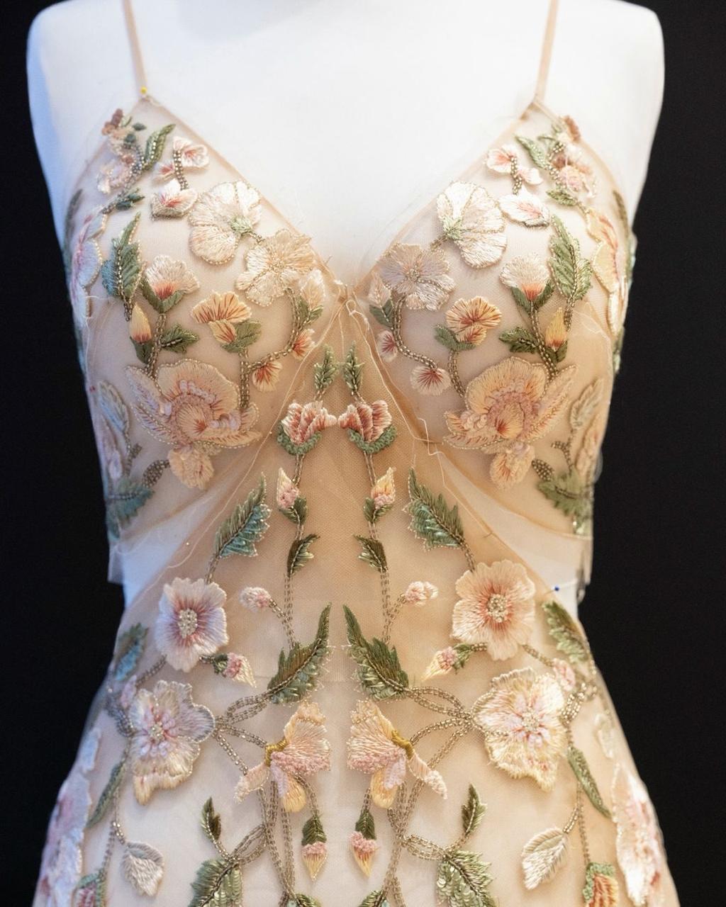 Образ был построен на контрастах. Пудрово-розовый атласный бомбер с шалевым воротником был надет поверх прозрачного тюлевого платья, расшитого в технике satin stitch и пайетками. Лёгкость, почти хрупкость платья сталкивается с архитектурной чёткостью и расслабленностью бомбера — и именно в этом столкновении рождается эффект «вау».