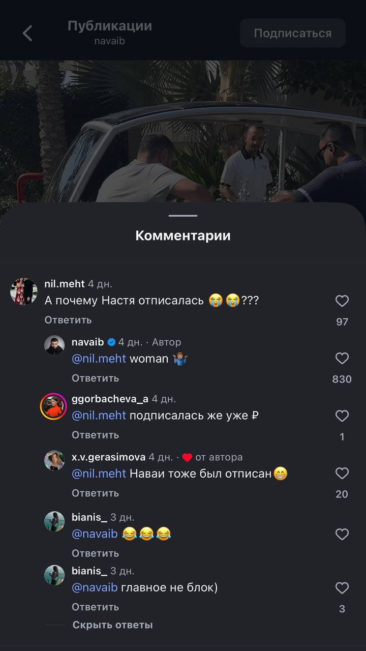 В своих сторис Наваи опроверг слухи о расставании с Настей Мироновой и посоветовал слушать его новый трек, а не Ксению Собчак и её «надёжные источники».