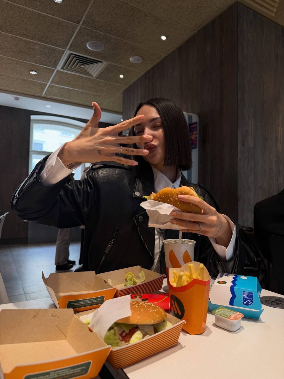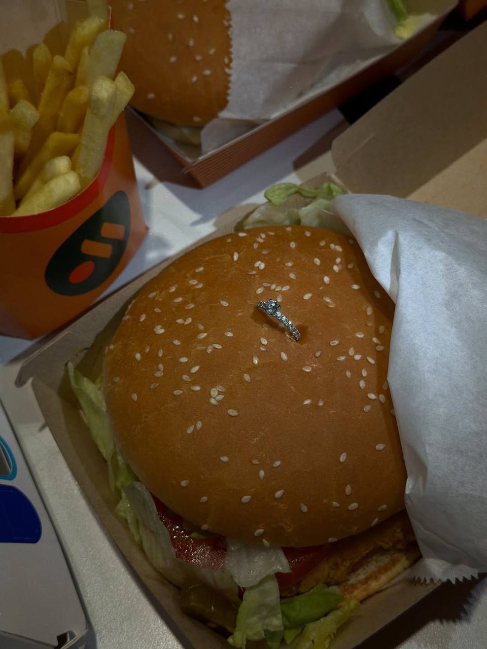 Потом забрали кольцо и устроили ещё одну помолвку уже в бургерной, где он вручил мне настоящее кольцо прямо в булке.