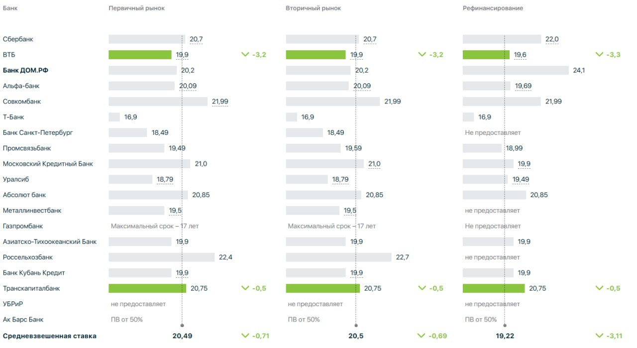 Средние ставки по рыночной ипотеке в топ-20 российских банков заметно снизились на прошлой неделе, — «Дом РФ». В итоге для первичного жилья они равны 20,49% (-0,71%), для вторички — 20,5% (-0,69%), а при рефинансировании — 19,22% (падение сразу на 3,11%).