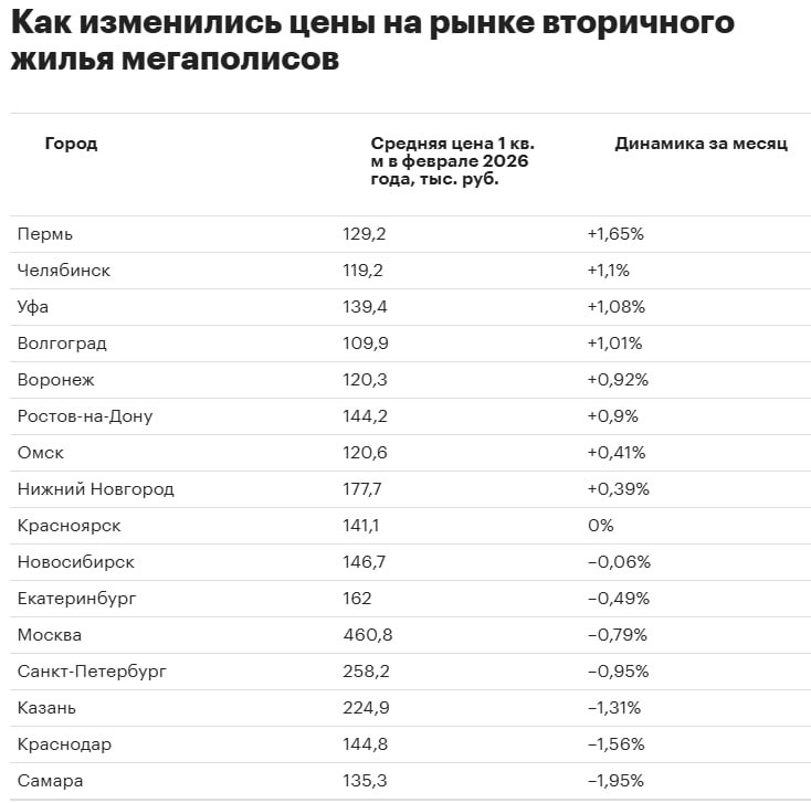 Как изменились цены на вторичное жилье в крупнейших городах России в феврале. Динамика вышла неоднозначной: чуть больше чем в половине мегаполисов стоимость квадратного метра выросла, в остальных — снизилась. Чемпионами роста стали Пермь, Челябинск и Уфа (+1,65%, +1,1%, + 1,08% соответственно), а аутсайдерами — Самара, Краснодар и Казань (-1,95%, -1,56% и -1,31% соответственно).
