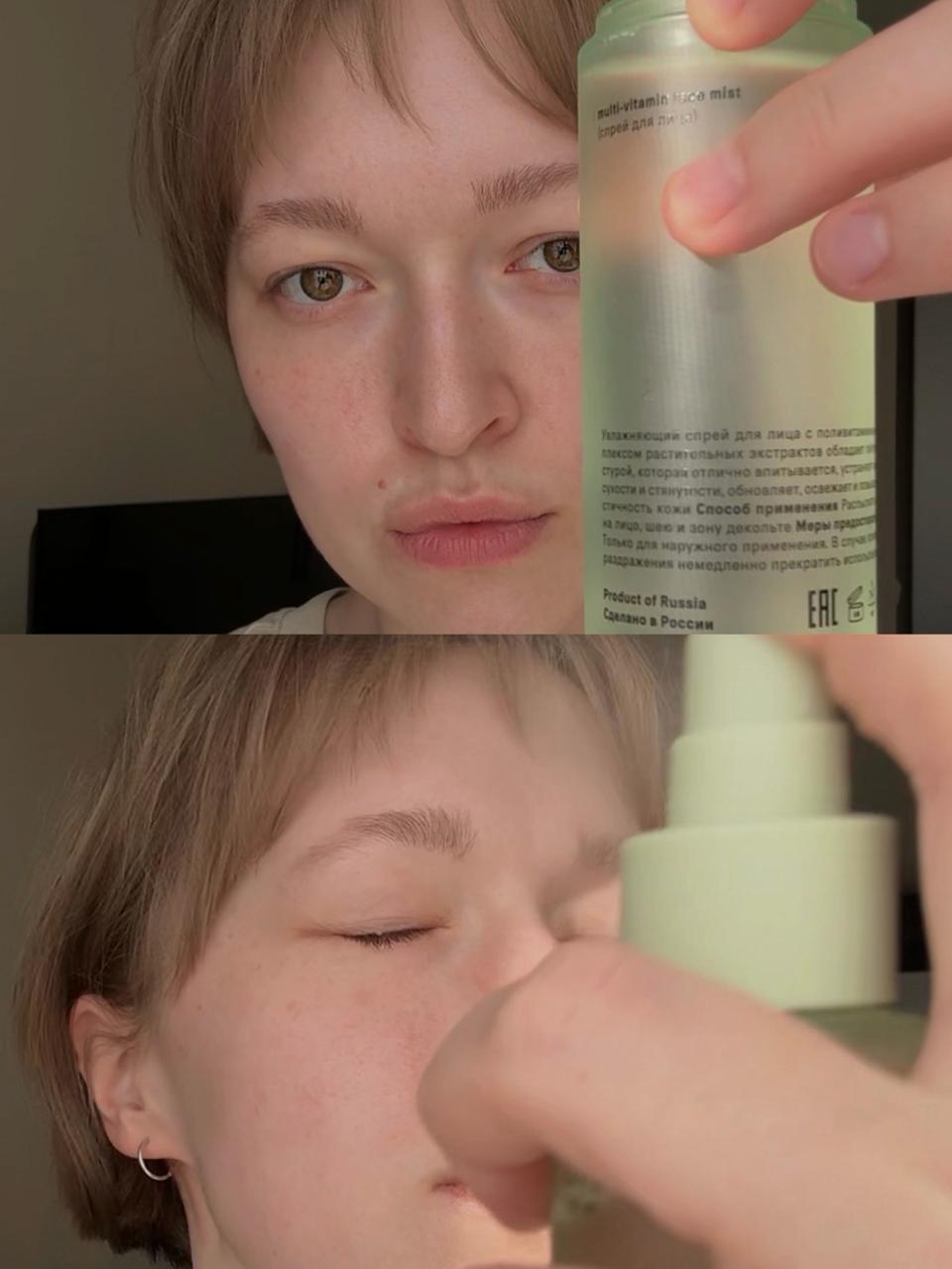 Помимо увлажнения, мист немного охлаждает кожу и успокаивает раздражения. На фото Настя дома без косметики, но иногда она берет спрей с собой на работу и использует в офисе. Макияж он не съедает и помогает чувствовать себя гораздо комфортнее.
