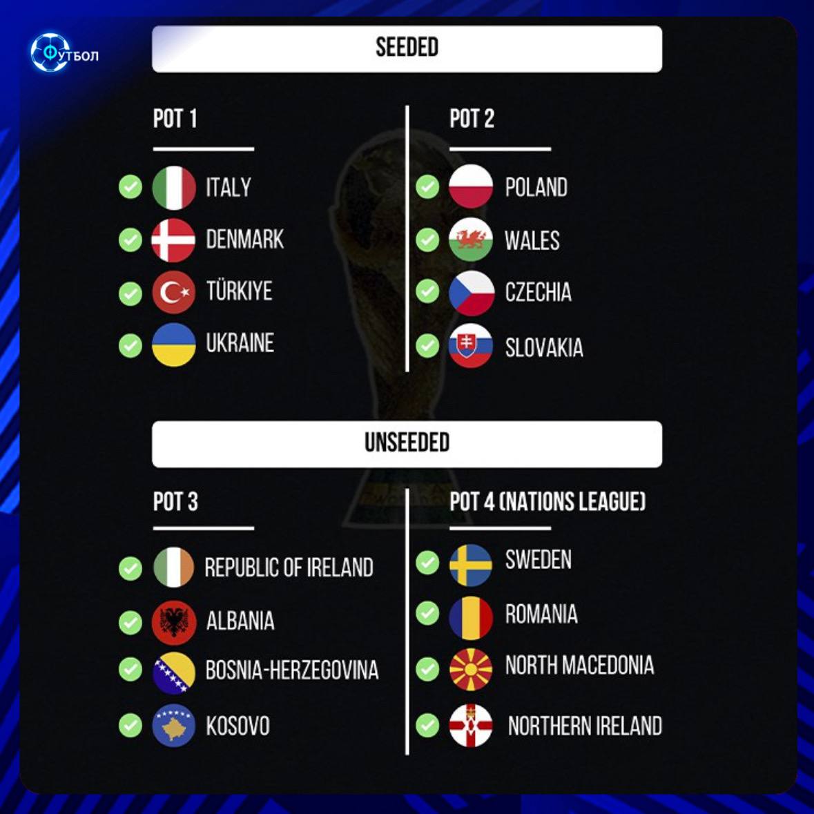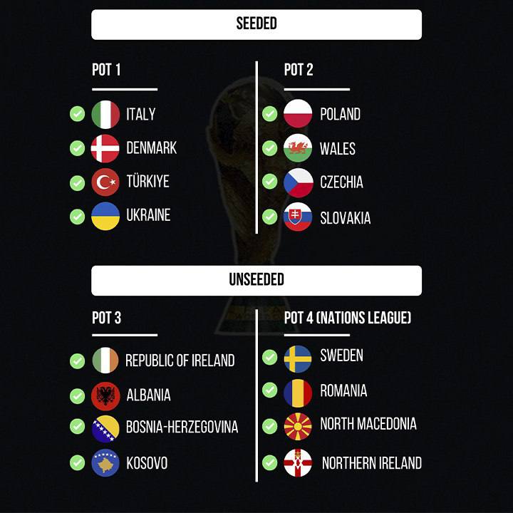 📌 Вышли в стыковые матчи через Лигу наций: Румыния, Северная Ирландия, Швеция, Северная Македония.
