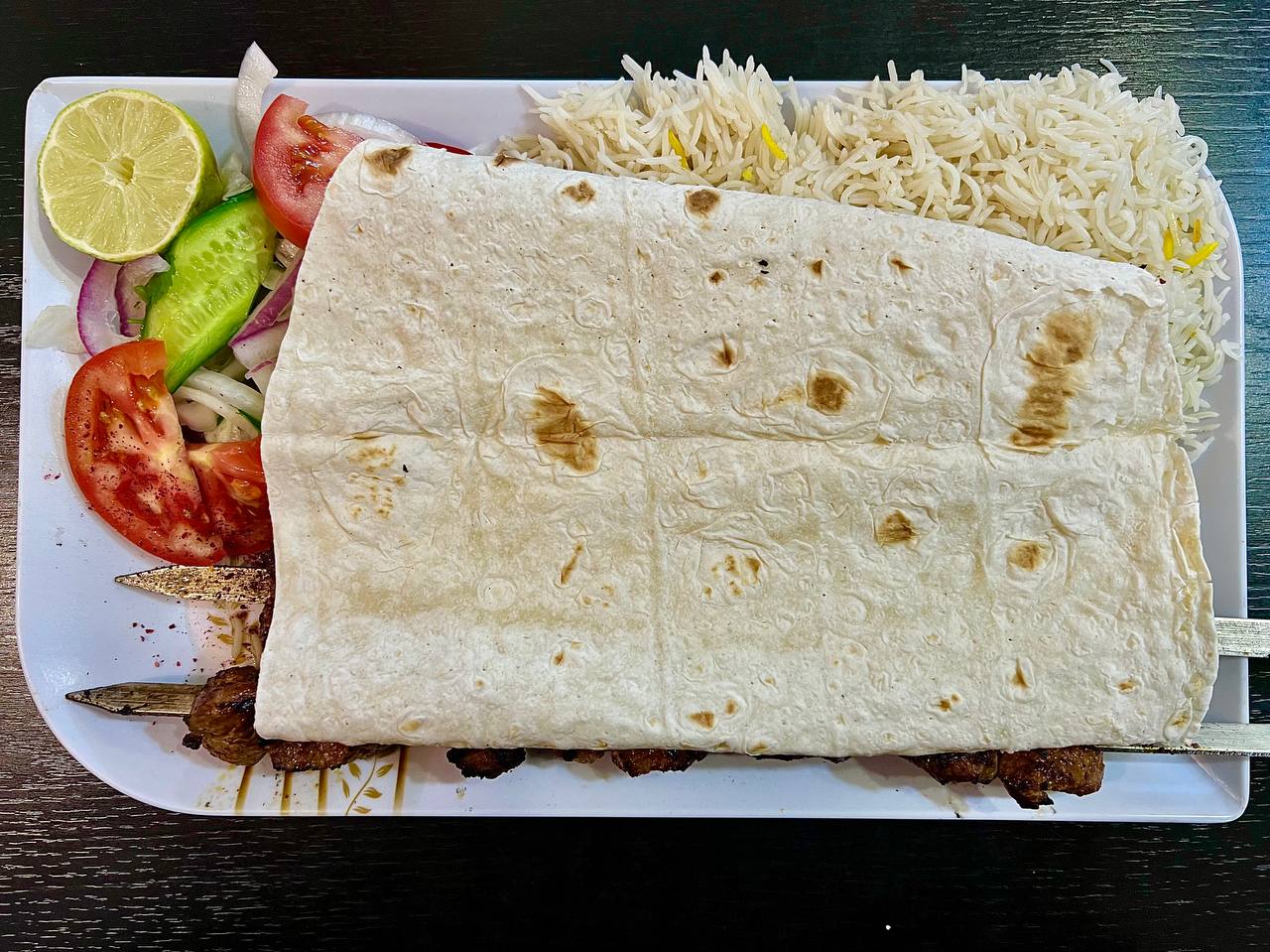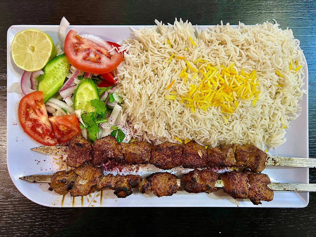 Два шампура, рис, салатик, лайм, что немаловажно, — большая порция на одного. Рис приготовлен на пару, сам в рот насыпается. Идеально.