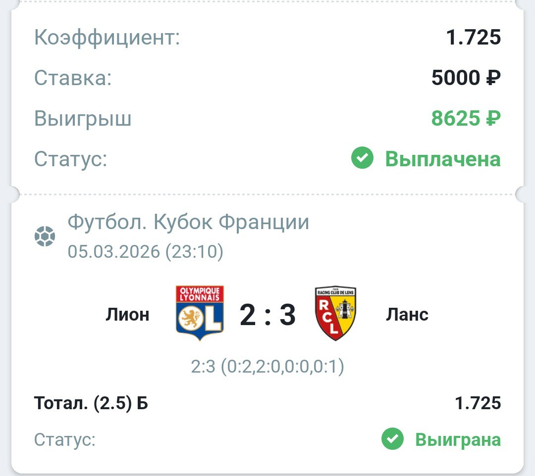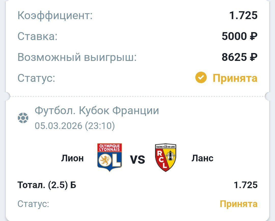 «Ланс» держался за первое место в Лиге 1 сколько мог. Ему спасибо, что оживил интригу, но в конце зимы сдал и он. Команда Пьера Сажа неожиданно уступила «Монако» (2:3), который, как все видели, был в кризисе. Сюрприз — потому что дома. Сразу следом не одолел ещё одного участника евросезона «Страсбур» (1:1). Теперь уже на выезде. Это вам не «Труа» в 1/8 финала Кубка Франции обыгрывать (4:2). Последний раз они пересекались в Лионе в мае 2025-го. Тогда уже не особо мотивированный «Ланс» обыграл рвавшийся в Лигу чемпионов «Олимпик» (2:1). Судя по этому сезону, «кроваво-золотые» стали только сильнее, поэтому я понимаю, почему они котируются почти так же, как «ткачи».