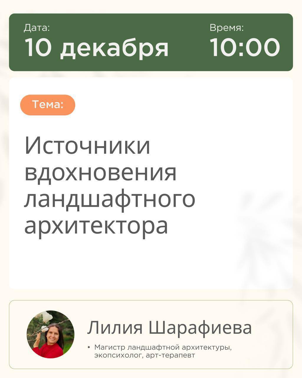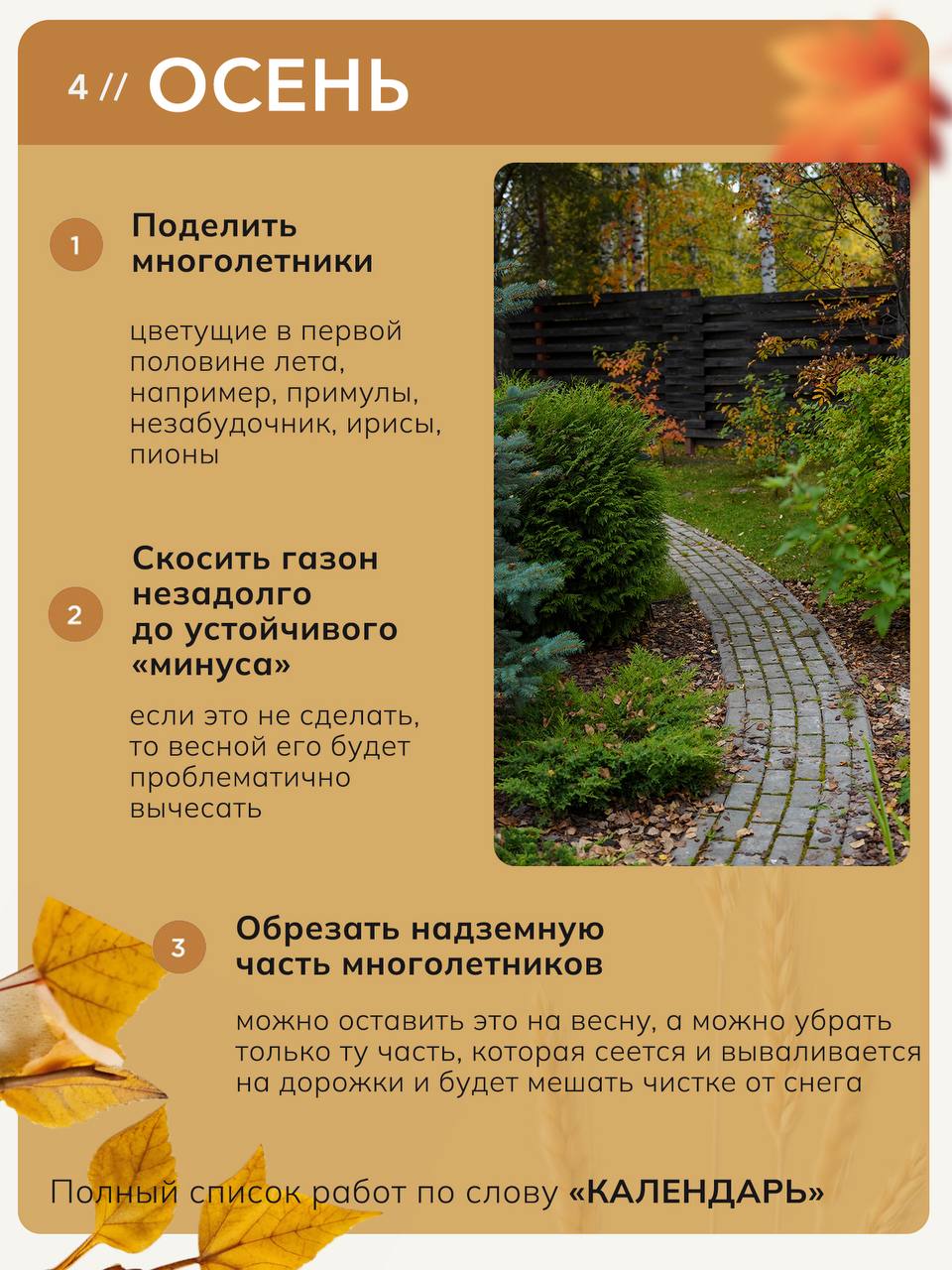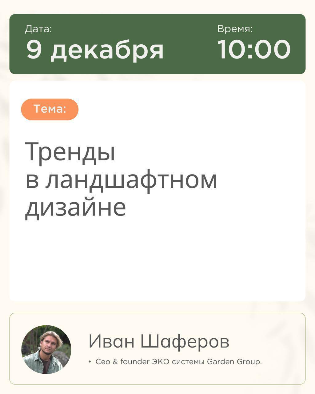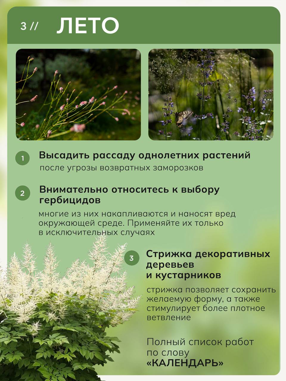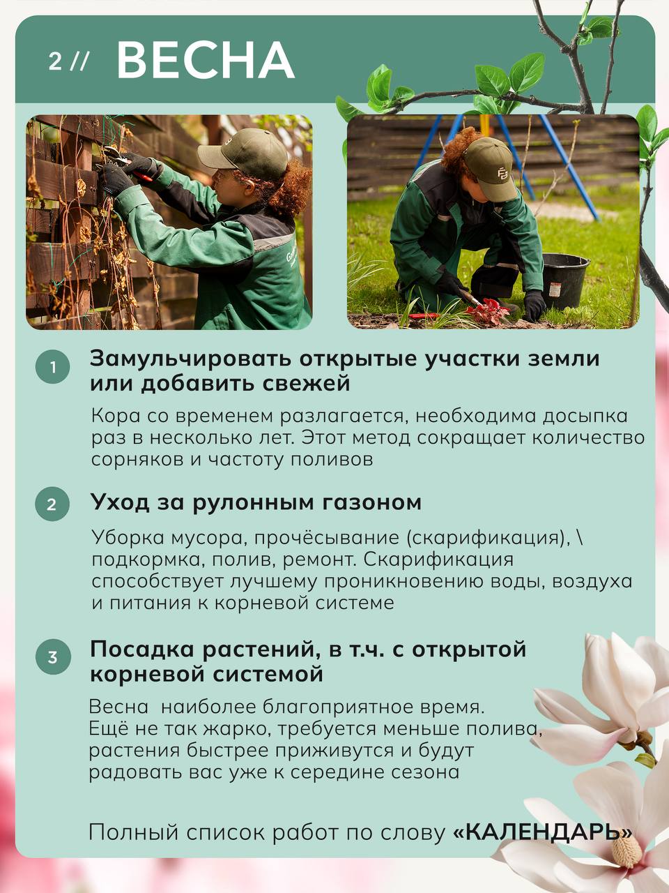 🌿 КАЛЕНДАРЬ СЕЗОННЫХ РАБОТ В САДУ: полный чек-лист Сад живёт в своём ритме. Пропустили момент — и последствия тянутся месяцами: ожоги после несвоевременного снятия укрытий, газон, который невозможно вычесать весной, ослабленные растения, ушедшие в зиму без влагозарядки Мы собрали весь опыт ухода за садами в один документ — чек-лист сезонных работ с пояснениями по каждому пункту 🌸 Весна: Подготовка теплицы, правильное снятие укрытий, санитарная обрезка деревьев и кустарников, запуск системы полива, первые азотные подкормки, посадка растений с открытой корневой системой, мульчирование ☀️ Лето: Режим кошения и полива газона, стрижка декоративных кустарников, уход за однолетниками, критический момент в борьбе с сорняками — до их цветения 🍂 Осень: Деление многолетников по срокам цветения, посадка луковичных, влагозарядковый полив, установка укрытий, защита стволов от грызунов и солнечных ожогов, консервация автополива ❄️ Зима: Защита корневой системы при бесснежных морозах, работа со снеговой нагрузкой, планирование нового сезона Автор — Татьяна Шаферова, управляющая питомником Garden Group, основной эксперт курса «Мастерская садоводства», имеющая более 30 лет практики в садоводстве Забирайте чек-лист по ссылке, он поможет вам ориентироваться в сезонных задачах и даст вам стимул глубже погрузиться в изучение каждого пункта
