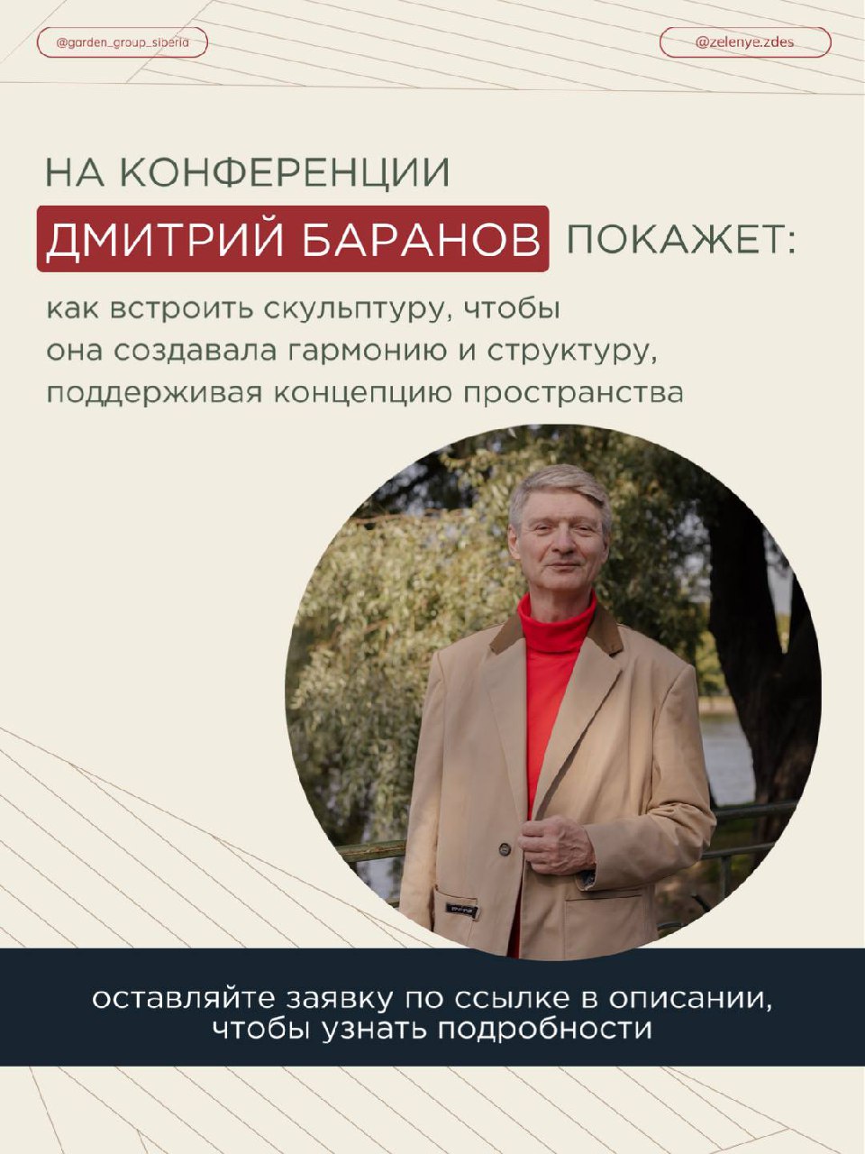 Современная скульптура в ландшафте: как придать саду структуру, объём и смысл Наш друг и партнёр Дмитрий Баранов, биолог, ландшафтный дизайнер, основатель ГК «Зелёная стрела», 21-22 февраля, примет участие в нашей ежегодной конференции с темой «Современная скульптура в садово-парковом и ландшафтном дизайне». Он поделится идеями и практическими подходами, которые помогут создавать гармоничные и функциональные пространства с помощью скульптуры. Также, Дмитрий проведёт автограф-сессию, где вы сможете пообщаться с ним в непринуждённой обстановке и задать все интересующие вопросы. Для участников конференции и выставки будет действовать специальная цена на его книгу «Современная садовая скульптура». 📅 21–22 февраля, 📍Лужники, Москва Дмитрий Баранов раскроет перед вами многообразие возможностей использования арт-объектов в пространстве садов и парков. И поделится своей уникальной насмотренностью. Оформить билет можно на сайте По вопросам рассрочки: @Zelenyelandscape. Информационные партнеры мероприятия: Строительная газета, Archi.ru, Урбан медиа, Экология жизни, La-la-landscape, Среда для жизни