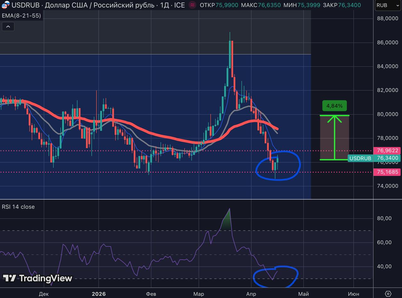 мы получаем пятый раз за последний год отбивку от этого диапазона (75.17-76.96).