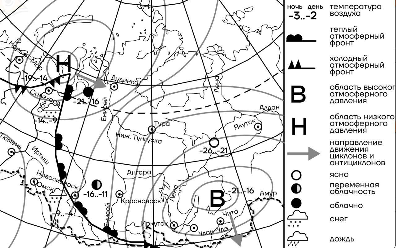 🔴 Линии тёплого и холодного атмосферного фронтов отмечены линиями с полукружочками и треугольниками