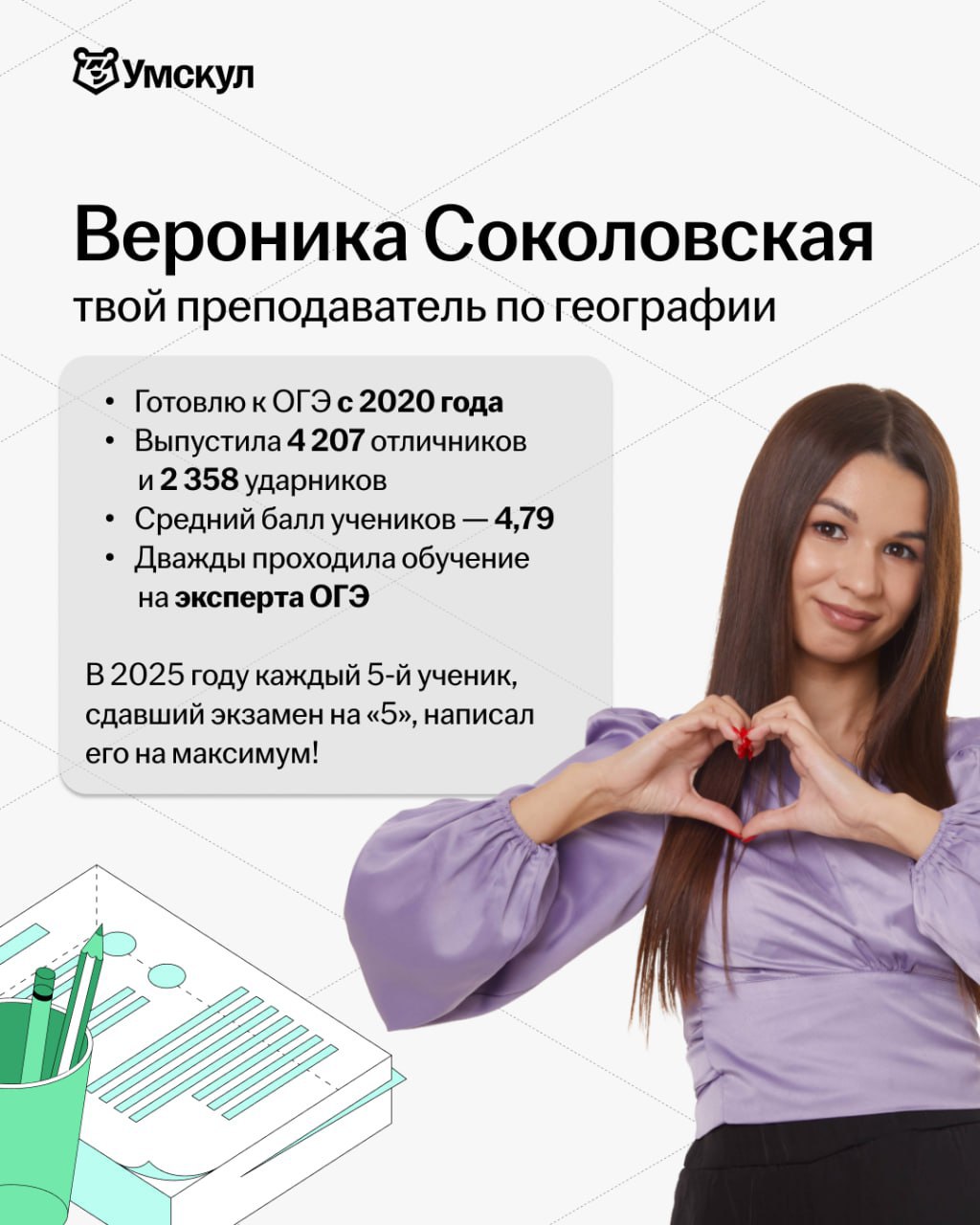 Привет, мои дорогие! Меня зовут Вероника Соколовская, я преподаватель по географии с 6-летним опытом.