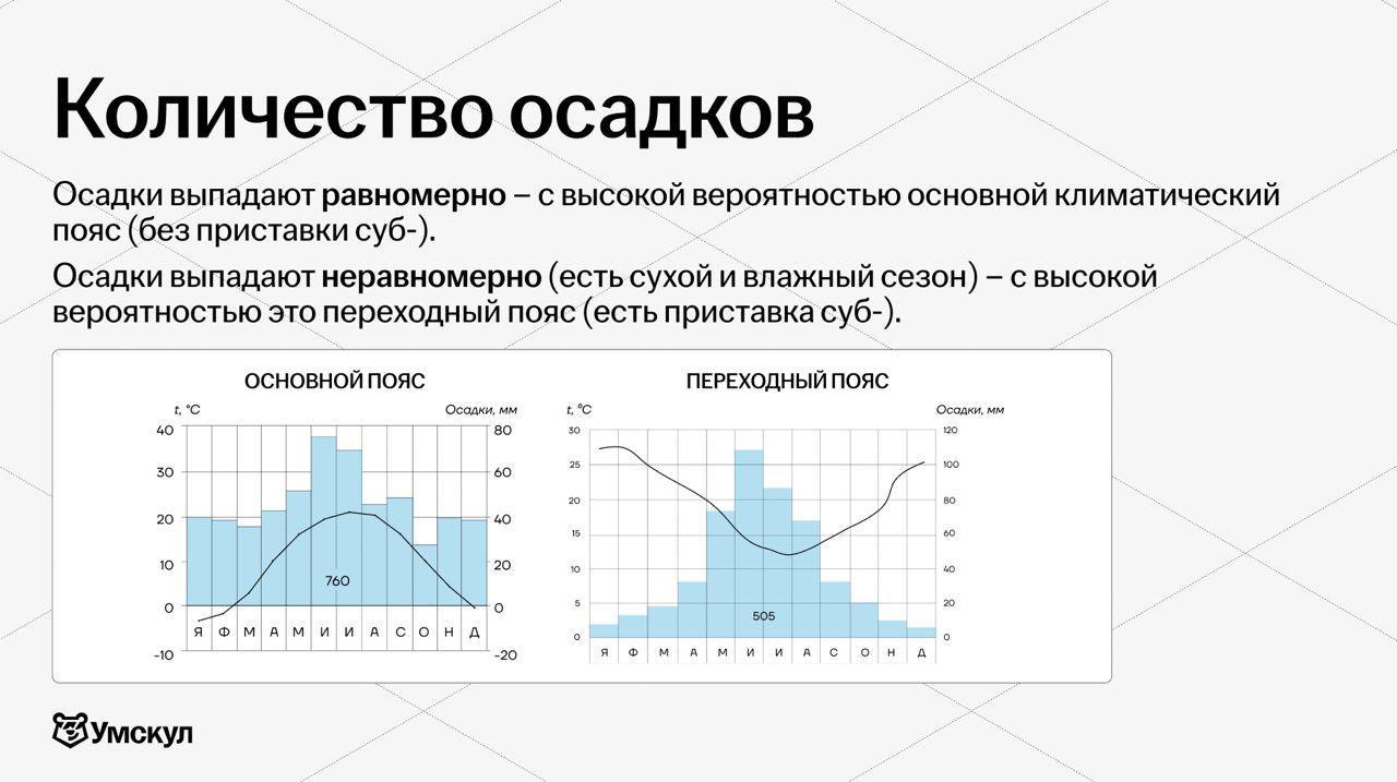 ➡️ Если вы видите, что на климатограмме есть и высокие, и низкие столбики (выделяется сухой и влажный сезоны) – с высокой вероятностью это переходный климатический пояс (у него есть приставка суб-, например, субтропический)