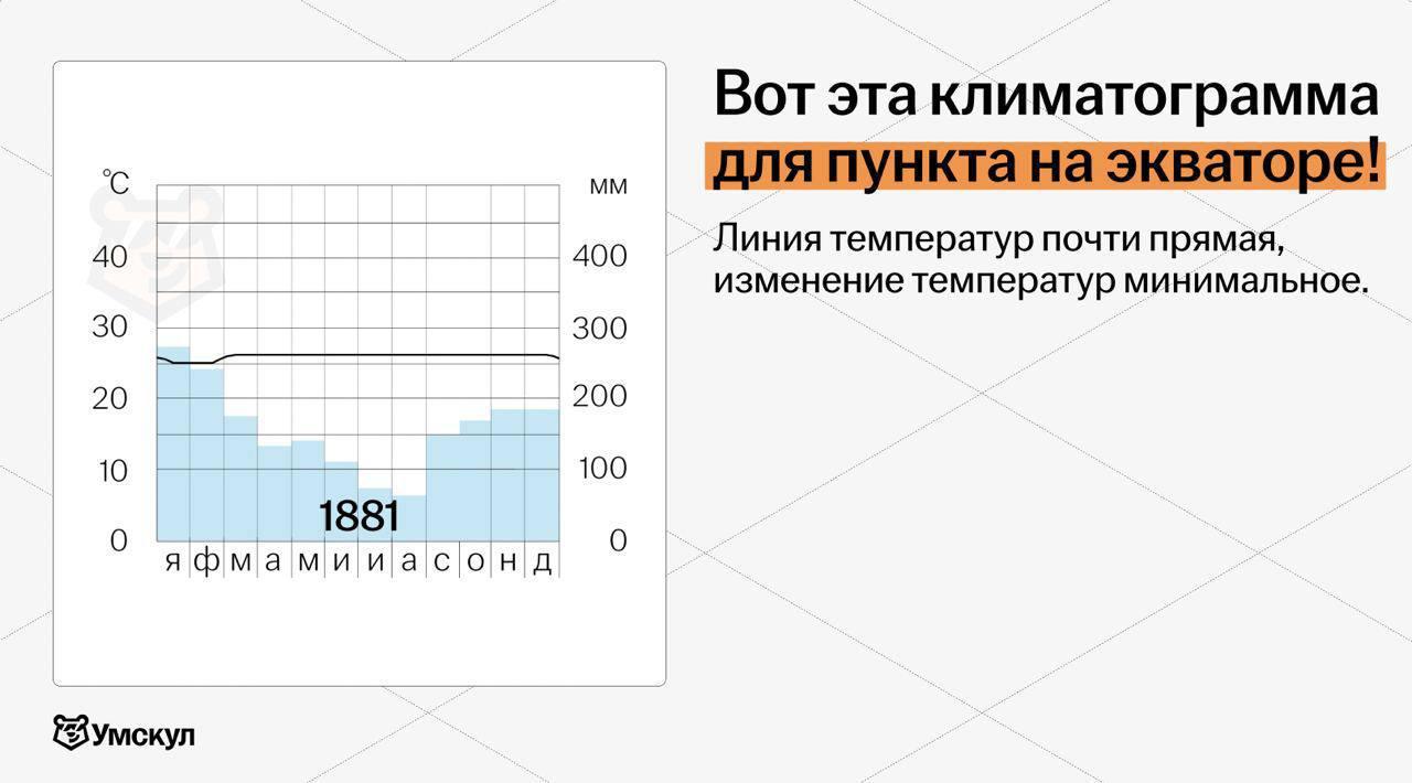 ➡️ Если осадки выпадают равномерно (столбики +- одинаковые по высоте, нет месяцев, когда осадков очень-очень мало) — с высокой вероятностью ваш пункт находится в основном климатическом поясе (у него нет приставки суб-, например, тропический)
