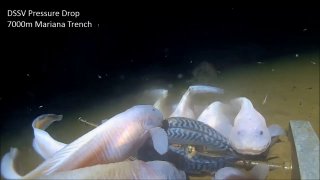 Перед вами стайка Псевдолипарис свирей - небольшие рыбки около 20 см в длину. Эти рыбы вместе с Абиссобротулой являются самыми глубоководными на планете - обитают на глубине ниже 8200 м. Там вечная и абсолютная тьма, но для чего-то у рыб есть глаза. Круглый год температура 1-4 град. Почти нет кислорода, зато все Таблица Менделеева. Недалеко от их обиталища огромное подводное озеро в кипящей серой. Второе такое только на Спутнике Юпитера Ио. Вокруг Черные курильщики - подводные извержения всякой гадости. Причем температура там достигает 450 градусов. Но из-за чудовищного давления вода даже кипеть не может. В том месте, где нашли наших героев, давление составляет 1070 атмосфер. Комфортное для человека давление 1 атм. При 17 мы можем погибнуть, выше - без вариантов. Тут 1070. Представить это невозможно: на каждый см тела будет давить 108 тонн.