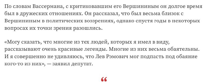 А что до Вершинин же «словами хотя я не прочь пожить еще, не дай мне Бог дожить до такого» намекнул на неадекватность Вассермана, - так я никак не могу "намекать на неадекватность Вассермана", ибо он - депутат Госдумы, где все по умолчанию кристально адекватны, и если автор текста считает иначе, фу ему.