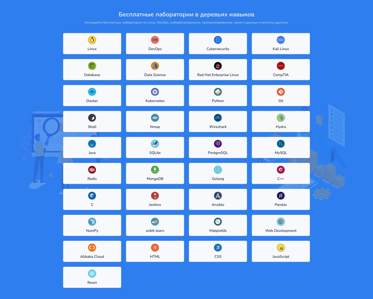 Лабораторные работы запускаются прямо в браузере: терминал, виртуальная машина и необходимое ПО уже настроены. Доступны обучающие треки по Python, Linux и DevOps (Docker, Kubernetes), кибербезопасности (Kali Linux, Nmap, Wireshark, Hydra), а также по базам данных (PostgreSQL, MySQL, SQLite, Redis, MongoDB).