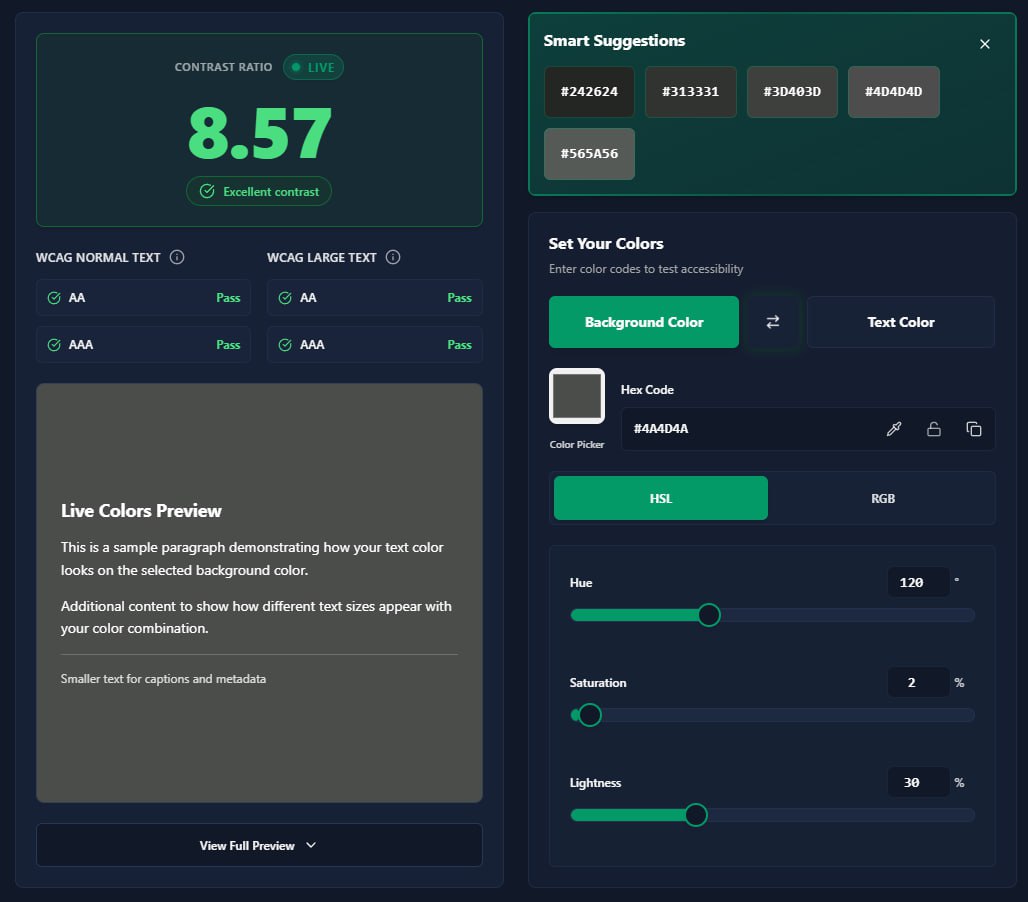 Smart Color Contrast Assistant — это инструмент для проверки контрастности WCAG на основе машинного обучения, созданный для дизайнеров, фронтенд-разработчиков и специалистов по обеспечению доступности.
